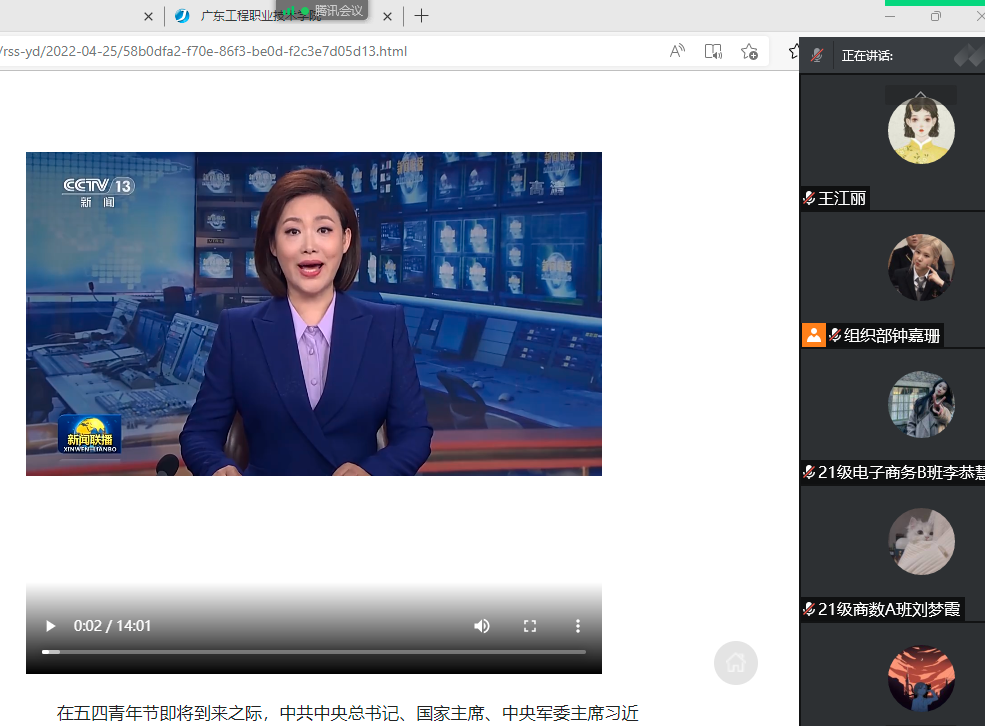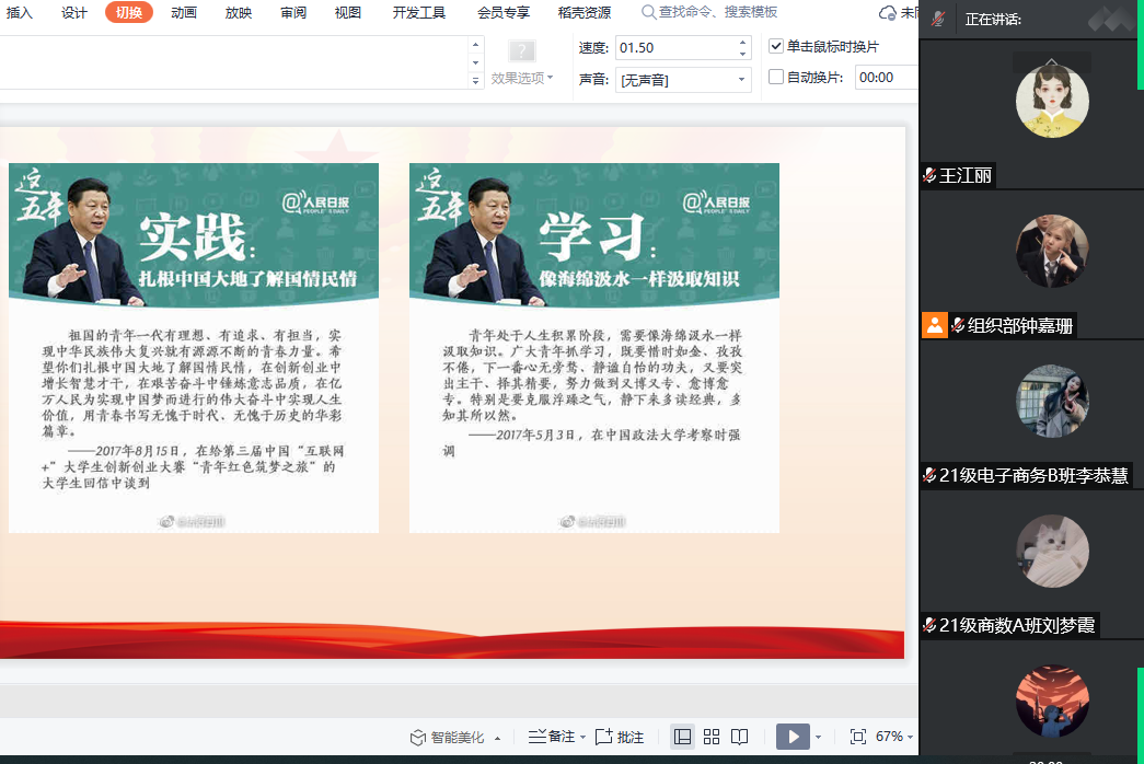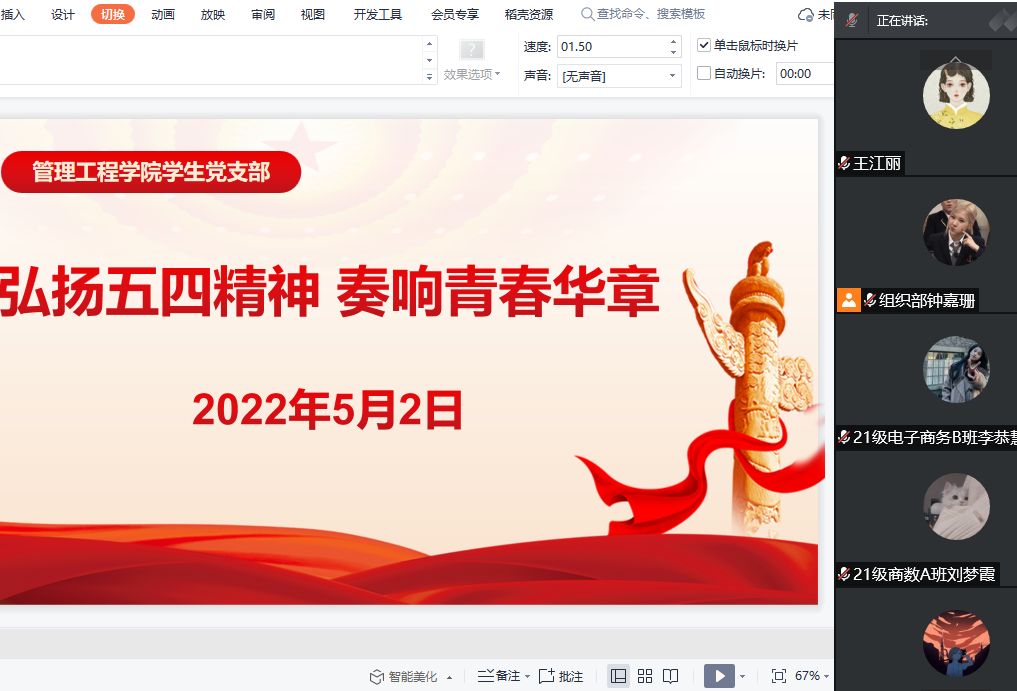 为继承和弘扬五四精神,坚定学生爱国爱党理想信念,发挥学生入党群体先锋模范作用,5月2日晚,管理工程学院学生党支部通过腾讯会议开展了主题为“弘扬五四精神,奏响青春华章”的主题党课学习,本次党课由学生党支部书记王江丽讲授,重点学习了习近平总书记4月25日考察中国人民大学的讲话精神。