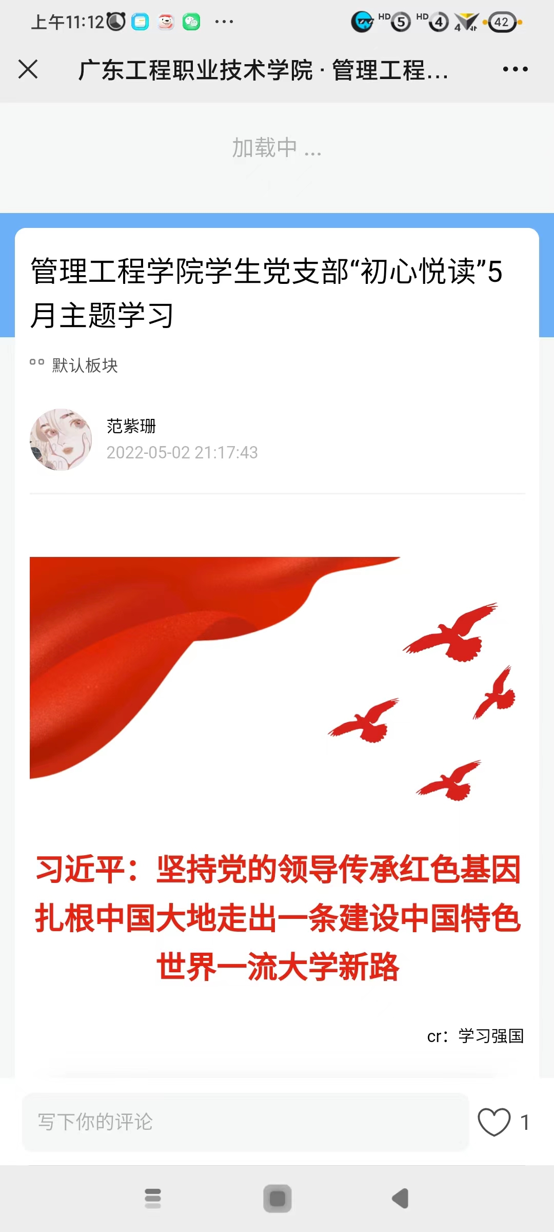 党课结束后,院学生党支部在易班上开展了学习“五四精神”为主题的“初心悦读”党日活动,所有学生党员、入党积极分子纷纷对自己的学习情况进行了分享与交流,他们纷纷表示,要始终牢记习近平总书记对青年人的期望和嘱托,用担当和创新传承五四精神,践行青春使命、奏响青春华章。