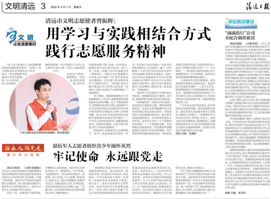 在这种培养氛围下,社会工作专业学生曾振辉秉承“助人自助”的专业工作理念,积极投身于校内校外的志愿者活动中,通过运用自己的所学专业知识,开展社会实践活动。在清远日报的报道中,曾振辉也深刻认识到,理论学习与实践结合才能有更大的收获,在入选清远市文明志愿使者,成为清城区首批普法志愿队成员后,表示将继续秉持专业工作素质、热情和奉献精神,积极投身于社会实践中。