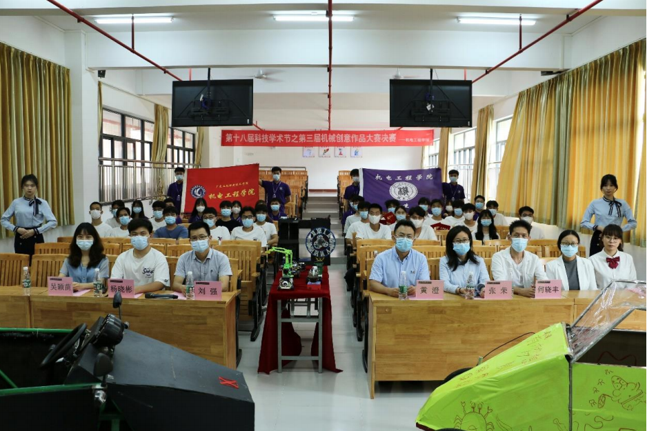 为培养大学生的综合设计能力和动手能力的,增强团队协作精神,进一步提升我校大学生科技创新能力,由校团委联合教务处、科技处主办,机电工程学院承办的第十八届科技学术节之第三届机械创意作品大赛决赛,于 5 月 18 日下午在清远校区教学楼 Q1-120 教室完满结束。出席本次比赛的嘉宾有机电工程学院党总支书记周奇舟、校团委