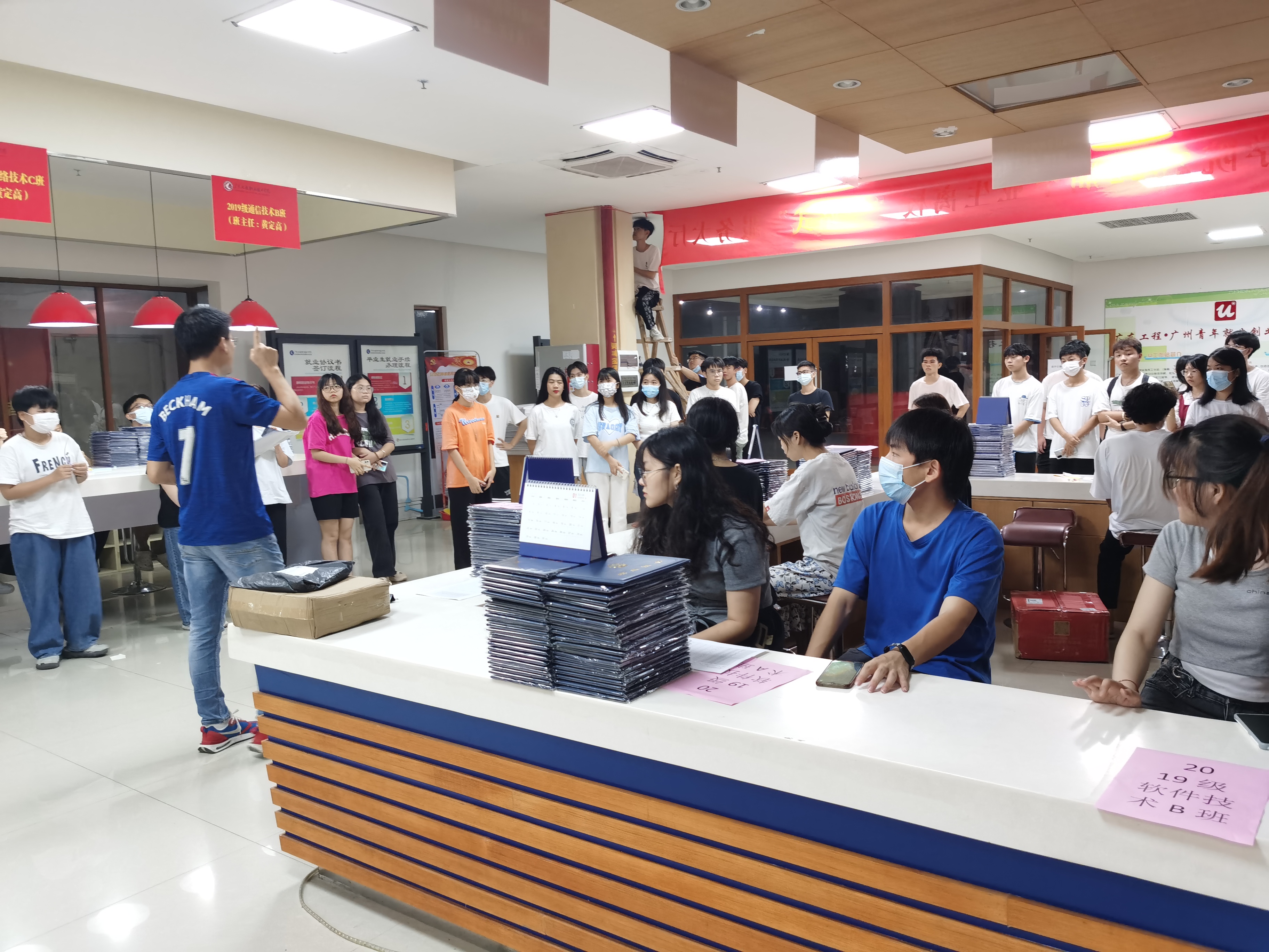 为了确保毕业生离校工作的顺利召开,信息工程学院领导班子高度重视,专门召开党政联席会议敲定毕业生离校的流程,并且积极落实。在志愿者人员确定后,在21日和22日共开展了两次培训,确保每一位志愿者都能明确分工,并且熟悉工作流程。23日晚上,许焕坚老师和杨华老师作为毕业班辅导员,一起带领志愿者到图书馆一楼就业指导中心布场,包括签名墙、各班水牌、团籍转出和学生证回收点,都设定了规定地点,让每一位学生在现场就能走完所有毕业流程。
