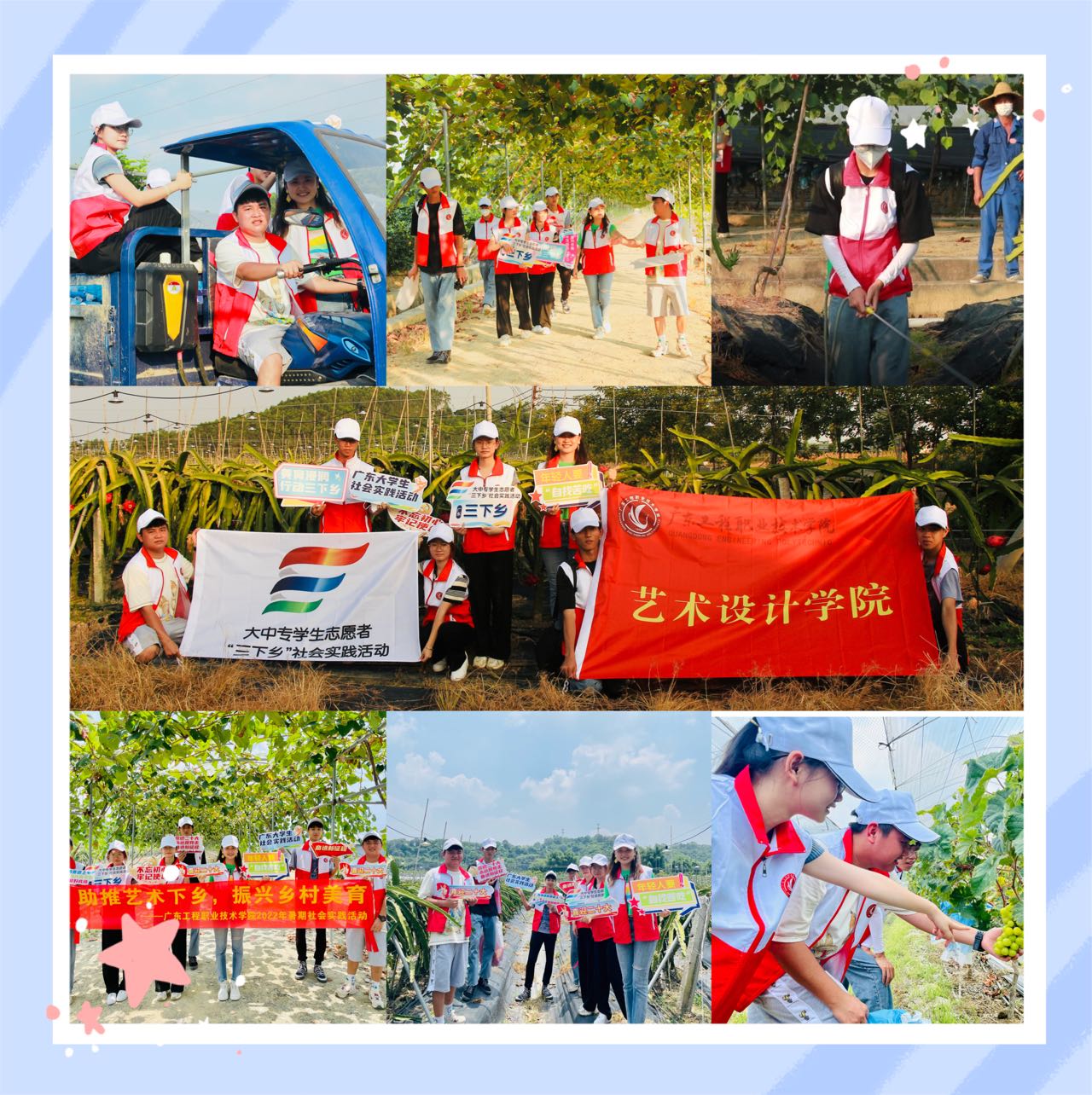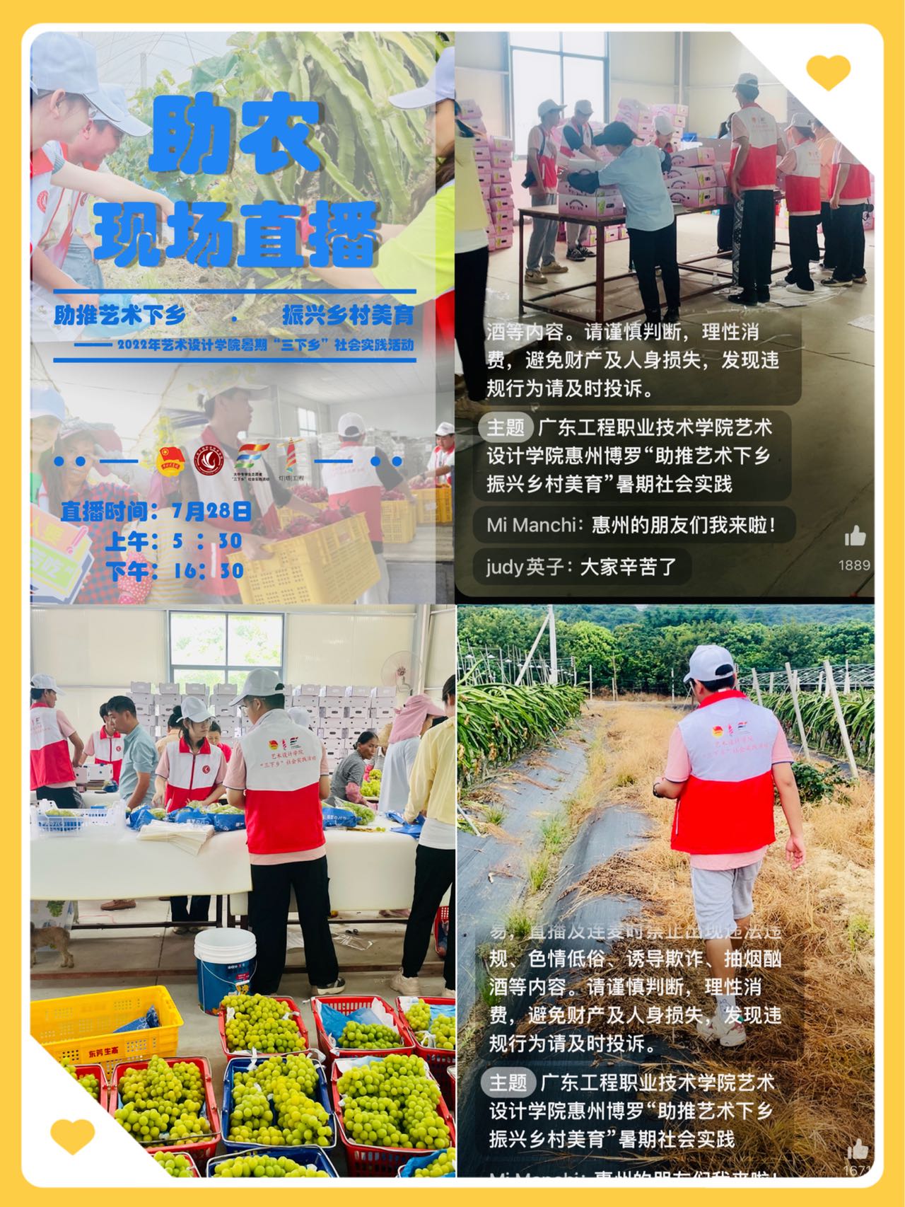 为贯彻习近平总书记关于青年工作的重要思想,引导和帮助广大青年学生在社会课堂中“受教育、长才干、作贡献”,以实际行动迎接党的二十大召开,2022年7月26日至7月31日为期六天,广东工程职业技术学院艺术设计学院向美而行实践团以“助推艺术下乡 振兴乡村美育”为主题,10名师生深入惠州市博罗县围岭村,开展特色乡村美育、实地考察调研、助农务农电商直播等内容系列社会实践活动。