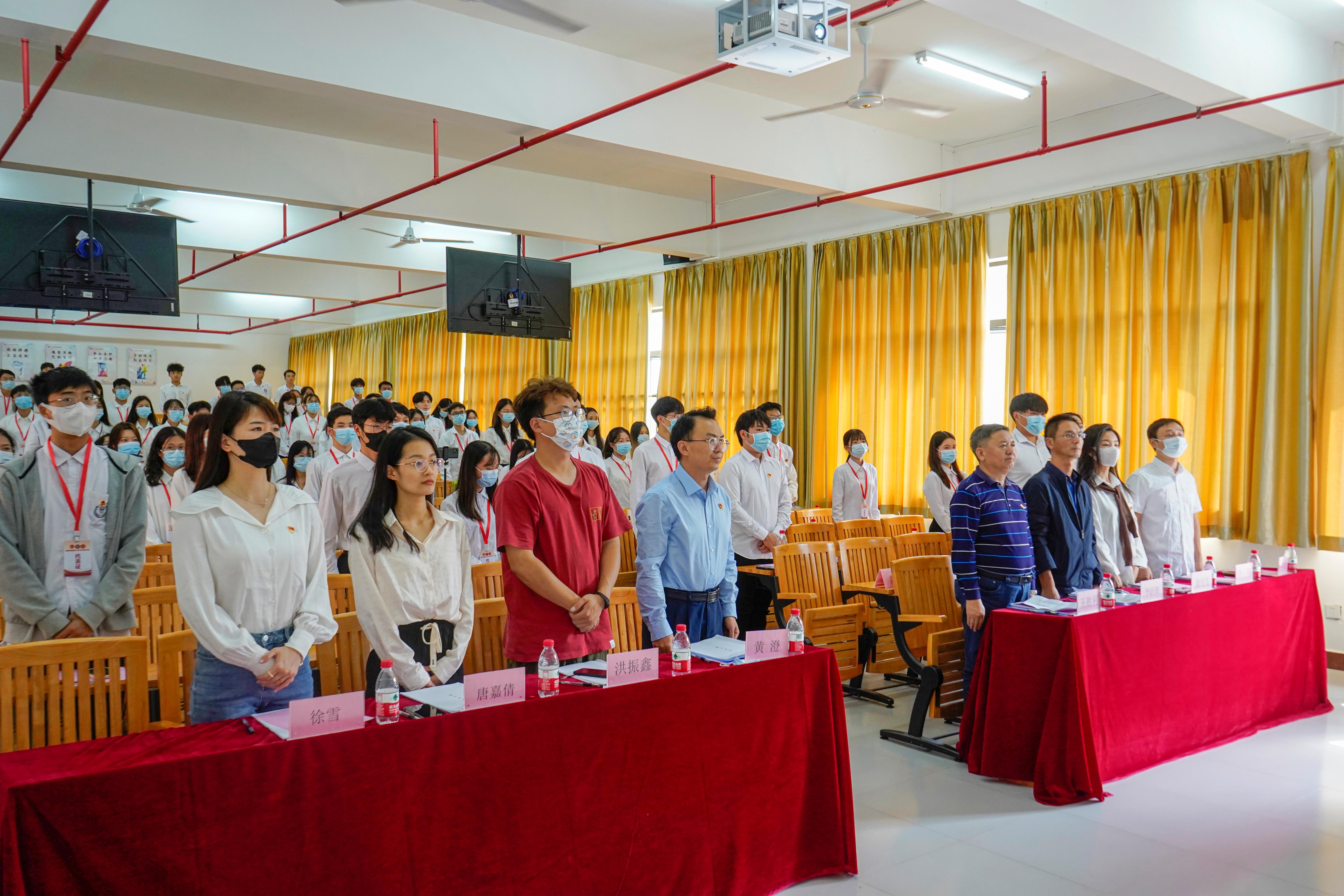 伴随着庄严的国歌声,学院第八次学生代表大会正式拉开序幕。首先,由林密蒲老师通报代表到会情况,校团委副书记黄澄宣读同意召开大会的批复。