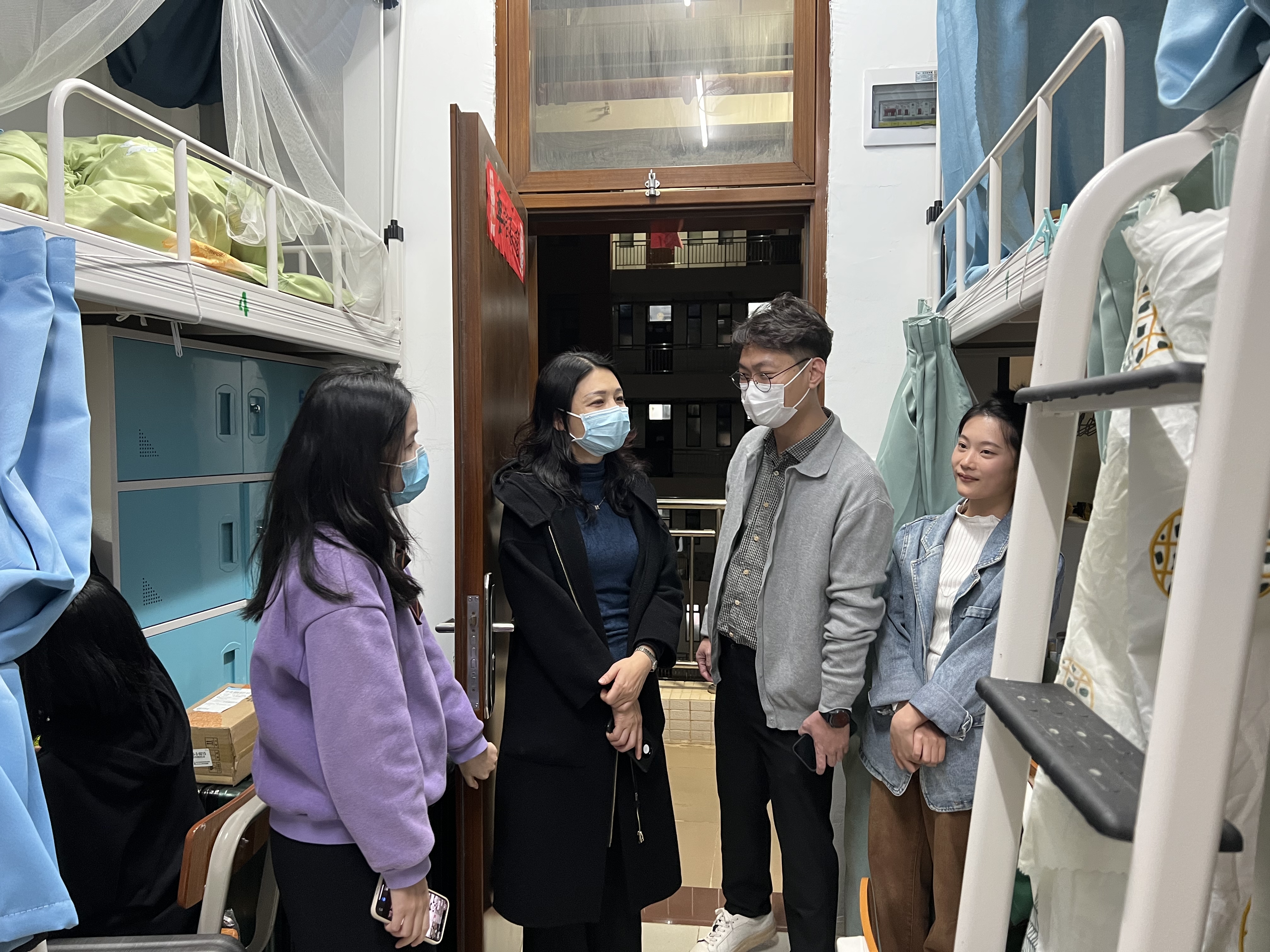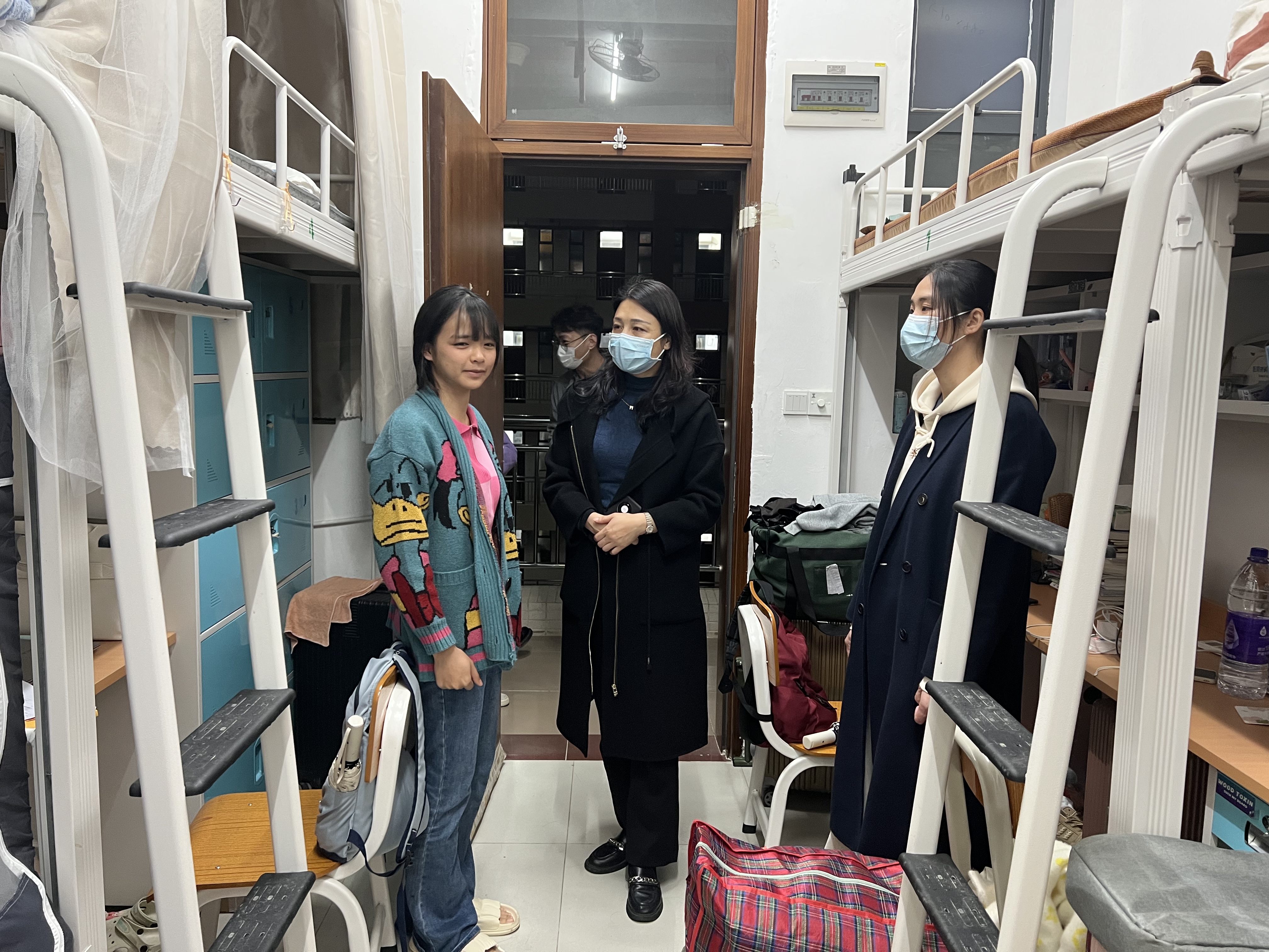 2月19日酒店管理学院学生返校报到,迎接2022-2023学年第二学期的到来。为进一步关爱学生,了解学生基本情况、思想动态及存在的困难,引导和帮助学生尽快适应新学期学习生活,2月19日晚我院副书记、副院长周琳带领全体辅导员及部分班主任老师深入走访学生宿舍进行慰问关怀。