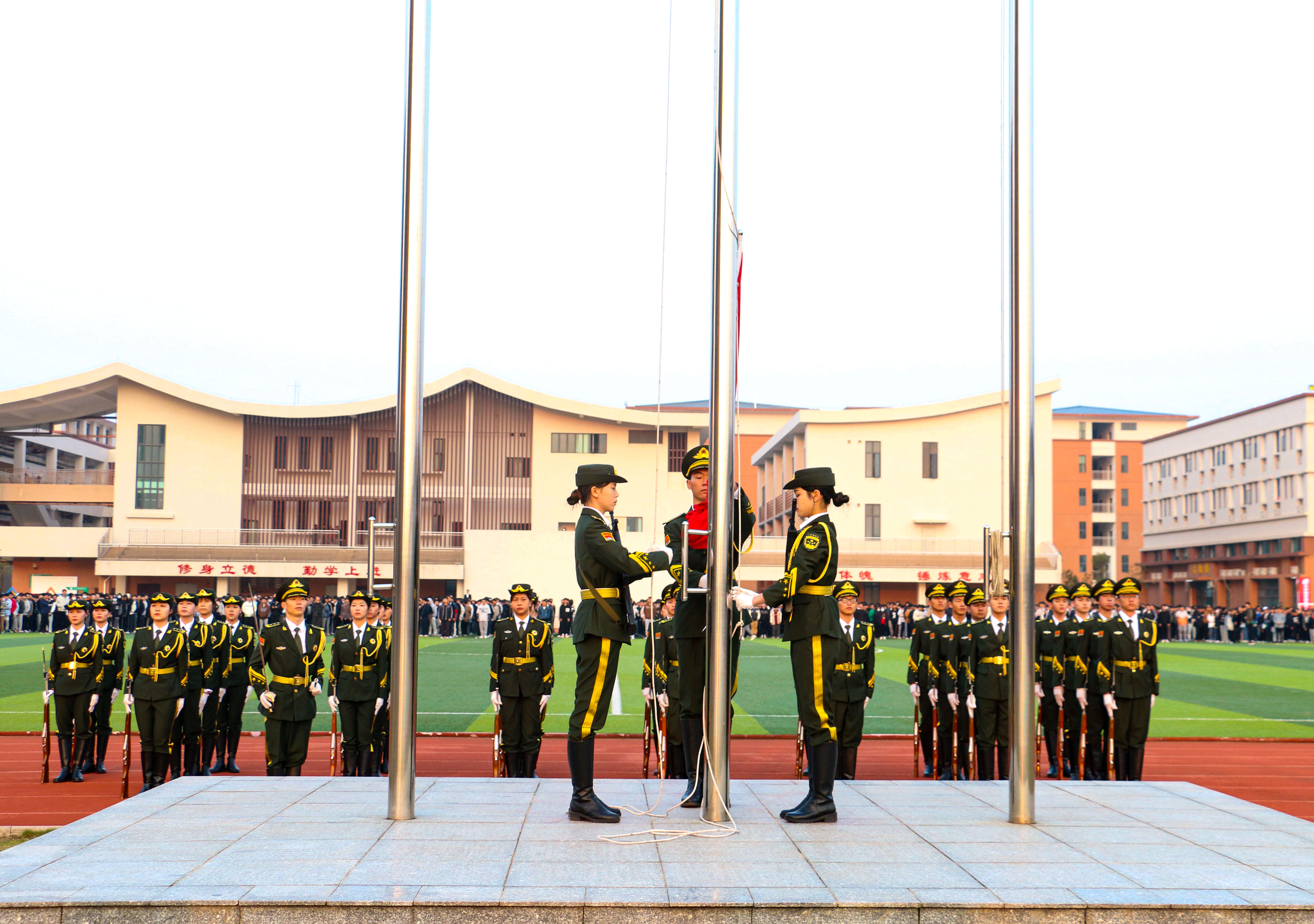 迎着清晨第一缕阳光,英姿飒爽的国旗护卫队护送国旗入场,昂首挺胸,口号嘹亮,迈着整齐的步伐来到升旗台。伴随着庄严激昂的国歌,五星红旗冉冉升起。全体人员行注目礼,炽热的眼神中饱含对祖国无限的热爱与对国旗无穷的敬意。