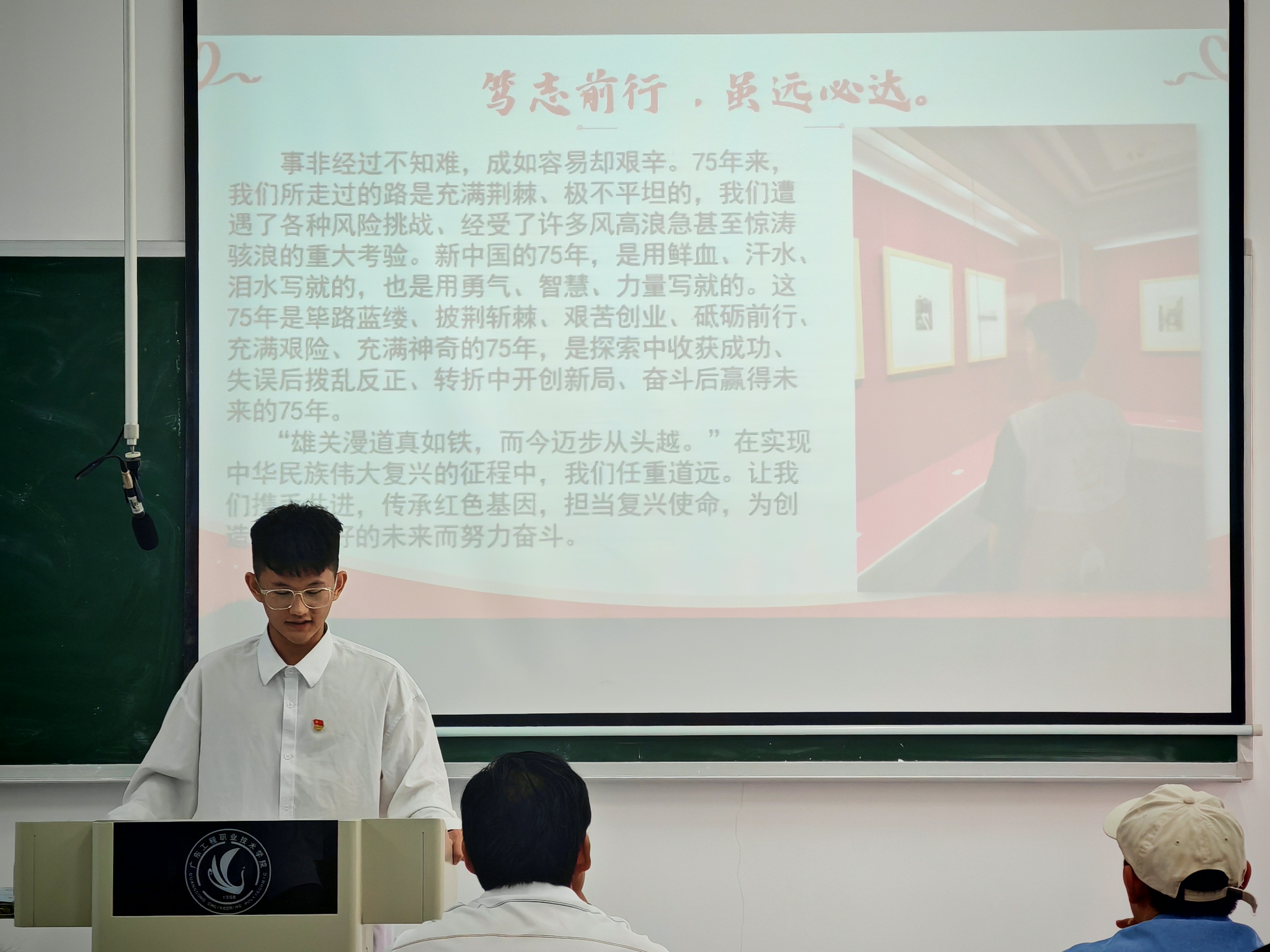 七十五载弦歌不辍,勇毅前行再谱华章。适逢中华人民共和国成立75周年,为了深入学习贯彻党的二十届三中全会精神,教育引导我院学生树立和坚持正确的国家观、历史观、民族观、文化观,增强我院学生的爱国意识和爱国情感。2024年10月11日,我院在Q6-326、Q6-327开展了“强国筑梦 复兴有我”庆祝中华人民共和国成立75周年红色主题宣讲比赛。建筑工程学院学生第一、第二党支部全体师生党员到场观摩,比赛由张伟群和万理主持。