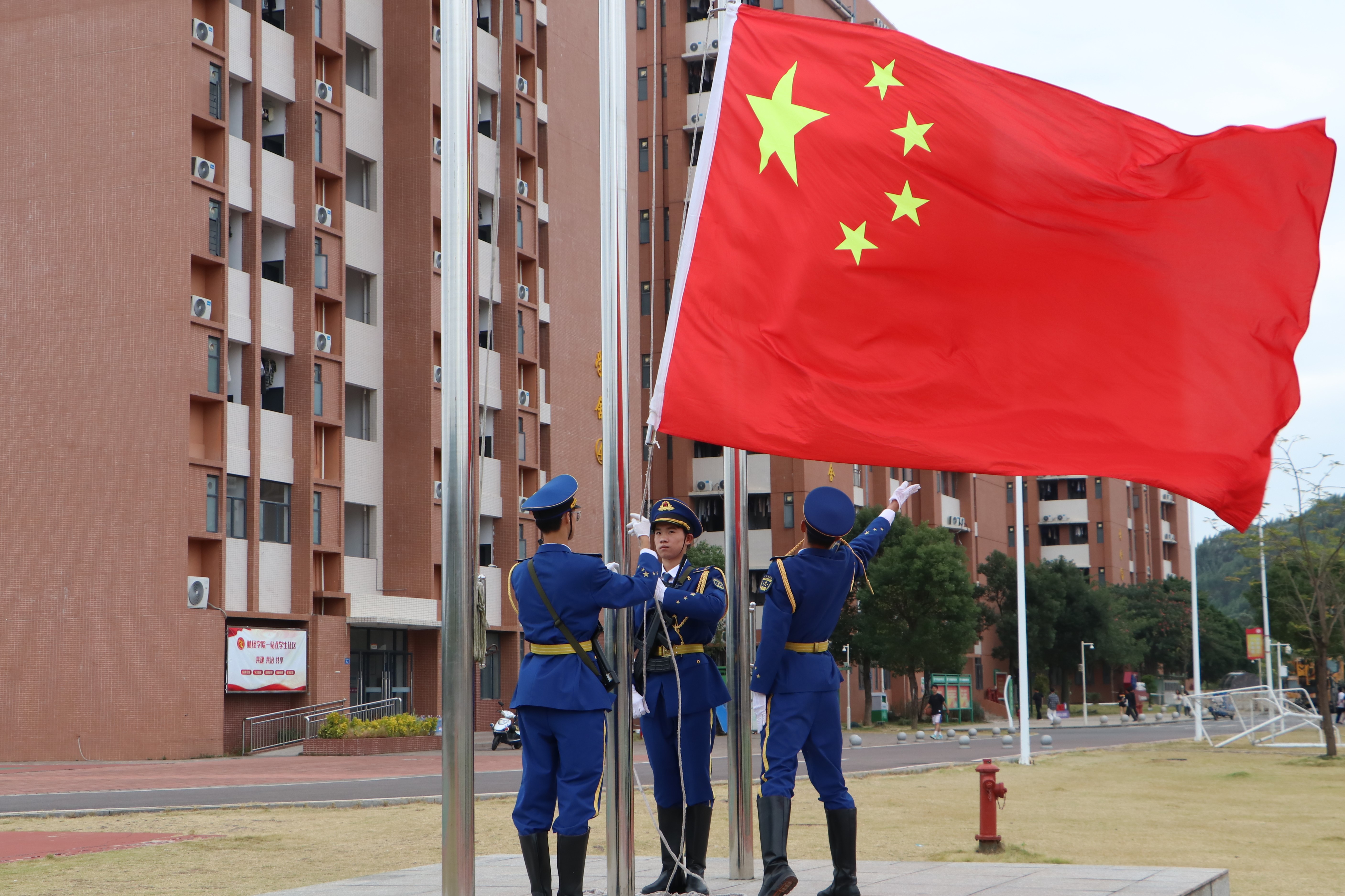 随着行进曲奏响,国旗护卫队气宇轩昂地行进,鲜艳红旗迎风飘扬,全场激情洋溢,掌声雷动。