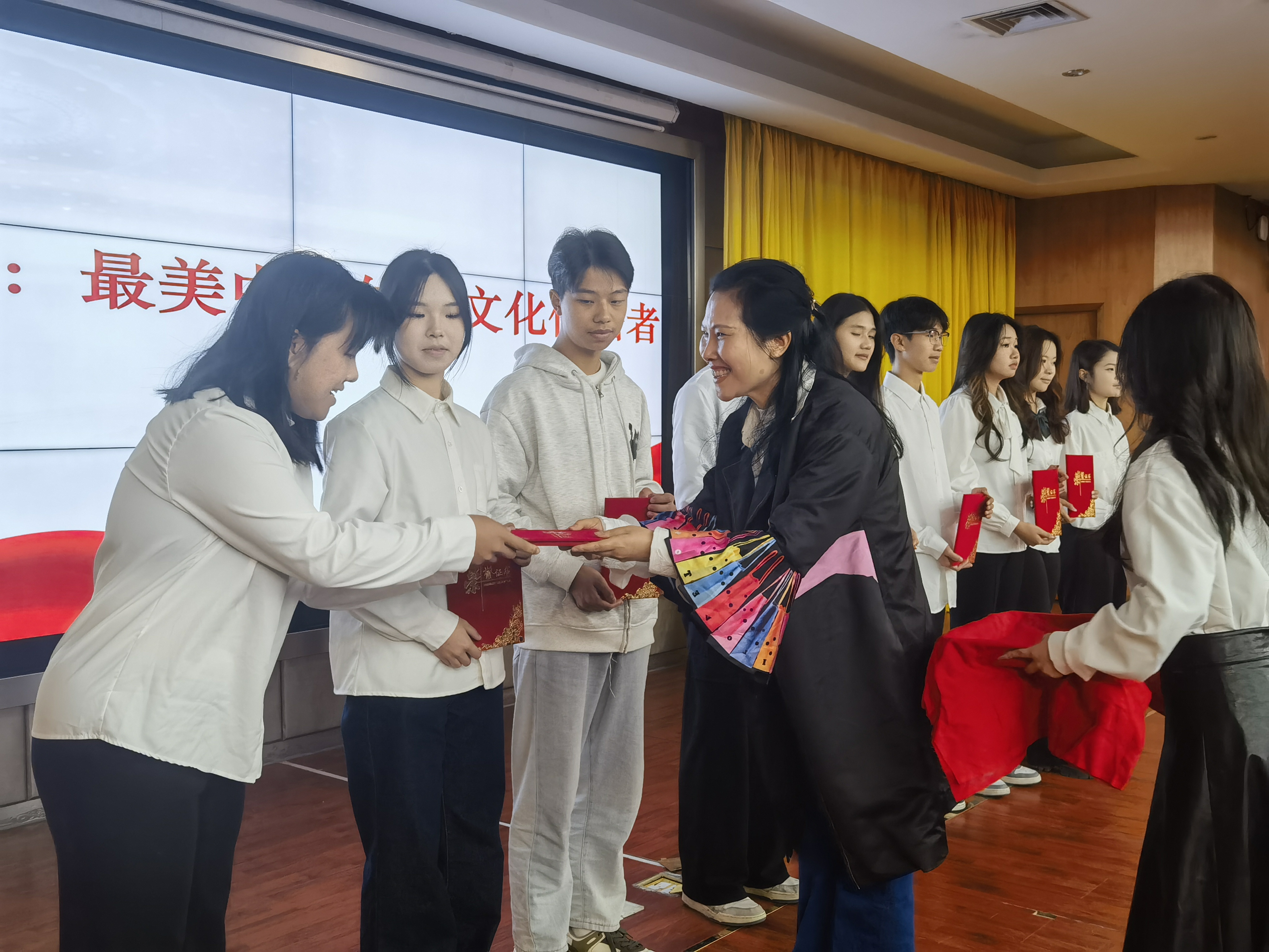 会议对本学期工作中表现突出的学生颁发了优秀机构干部、优秀志愿者、优秀模范标兵、优秀共青团员等10类奖。还特别邀请了广州市传承优秀文化促进会会长余雄丽颁发“最美中华传统文化传播者”奖项。余老师现场弹奏了了尤克里里,并将其赠送给学院。她在讲话中强调提升人文素养对于促进青年素质的提高具有重要的意义,要通过艺术丰富的活动形式促进青年人的心理健康、创新思维以及社交能力的全面发展。