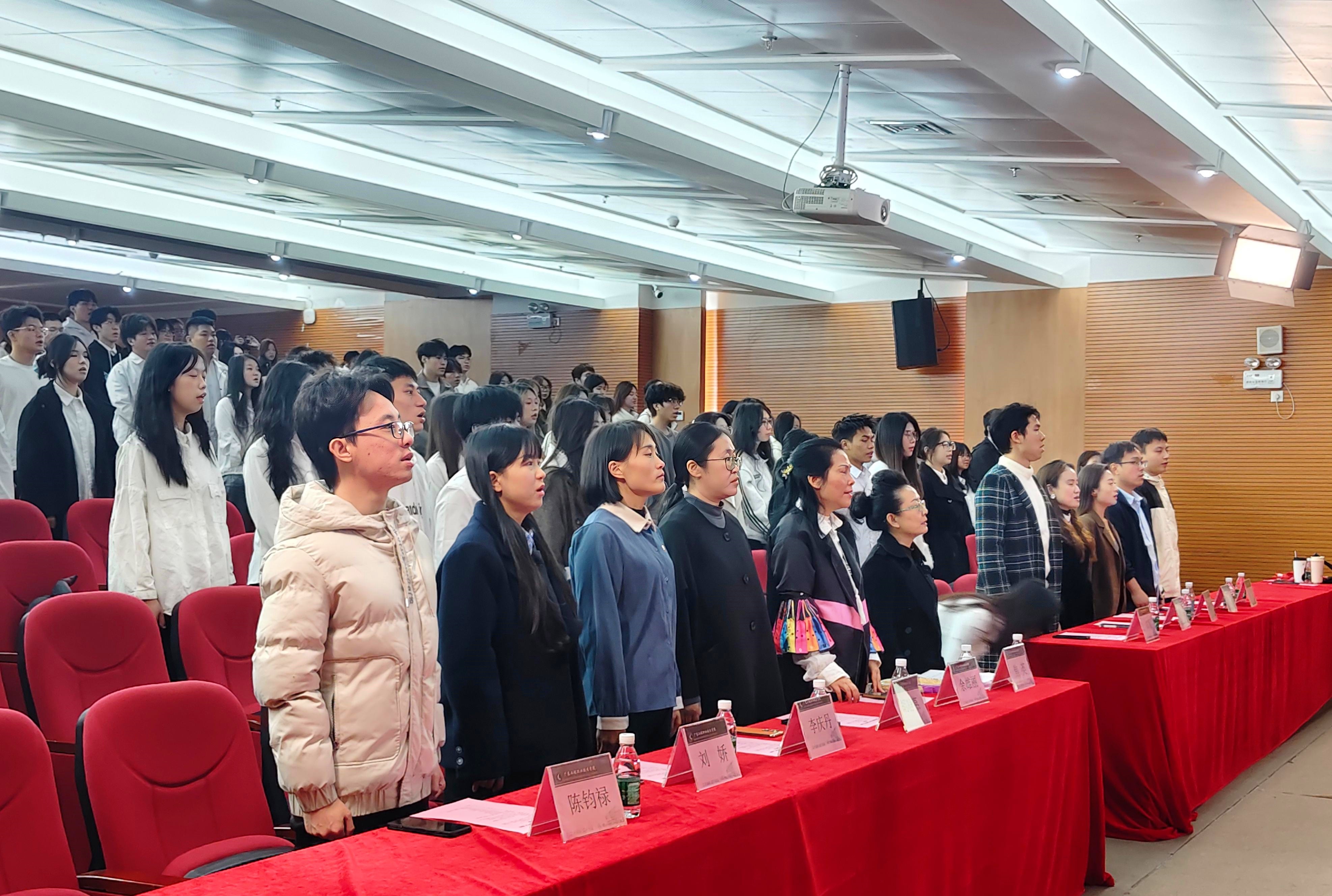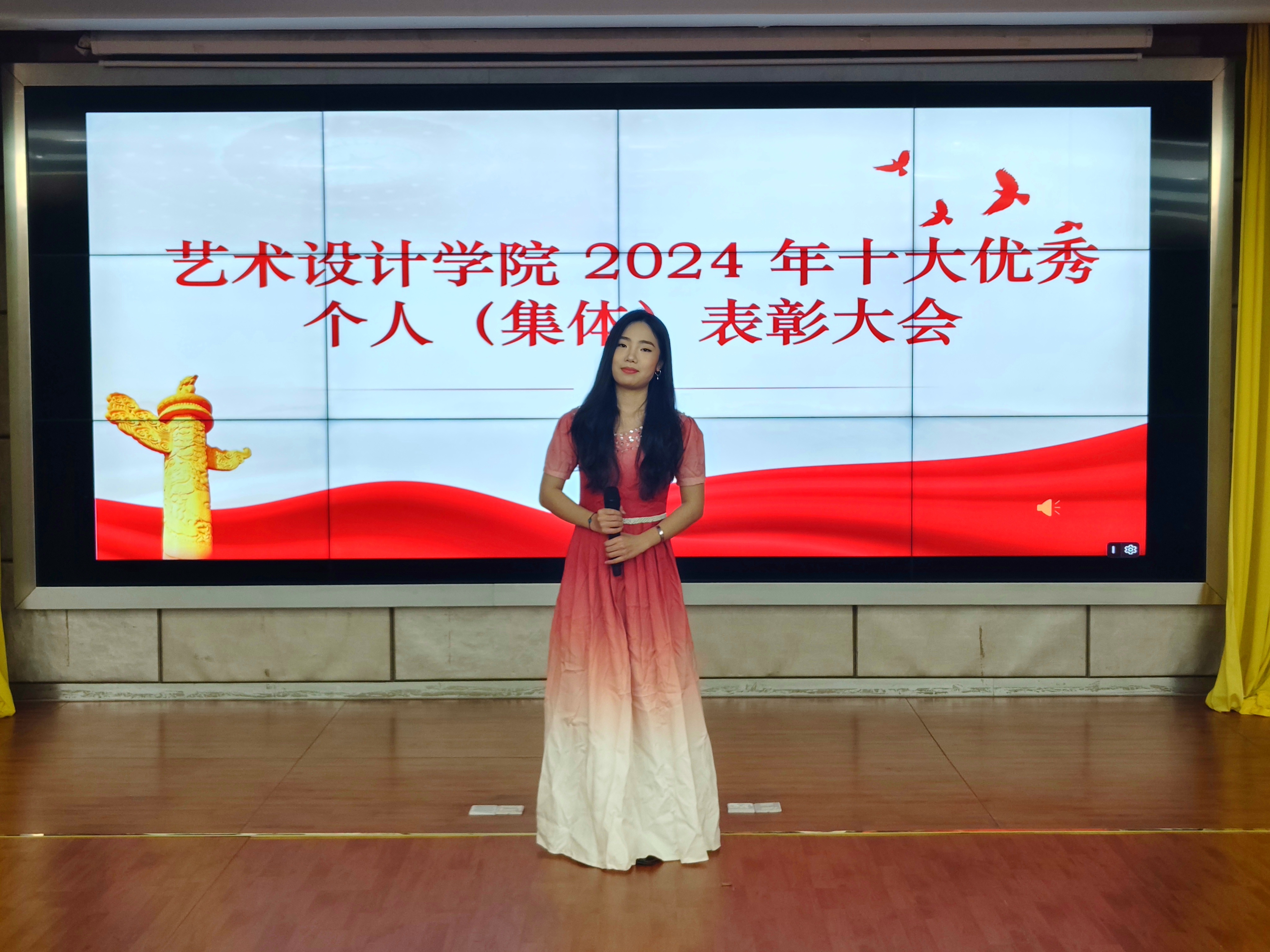 长风破浪会有时,直挂云帆济沧海。12月26日中午,艺术设计学院在图书馆报告厅举行了2024年优秀个人(集体)表彰大会。学院党委副书记焦英、广州市传承优秀文化促进会会长余雄丽、负责人郑烁及辅导员、教务员、受表彰学生代表参加了本次大会。开场前学院邀请了2024年校园十佳歌手艺术设计学院林家怡同学深情演唱《最美的太阳》暖场助阵,大会在庄严的国歌声中拉开帷幕,接着观看了精心制作的系列视频展播,回顾了2024年学生工作,志愿实践活动、社会实践及文化传承成果,旨在培养学生正确的价值观,激发学习热情和参与度。
