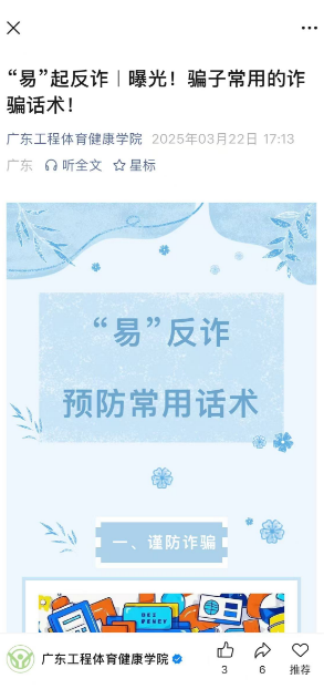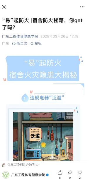 学院依托官方公众号搭建安全教育平台,精准推出《“易”起防火 |宿舍防火秘籍,你get了吗?》、《“易”起反诈|曝光!骗子常用的诈骗话术!》等系列推文,通过漫画图解、情景短剧等多元形式,构建消防、防诈知识传播矩阵,实现安全宣教趣味性与实效性的有机统一,推文突破传统说教模式,以学生喜闻乐见的视觉化表达促进安全知识深度吸收。