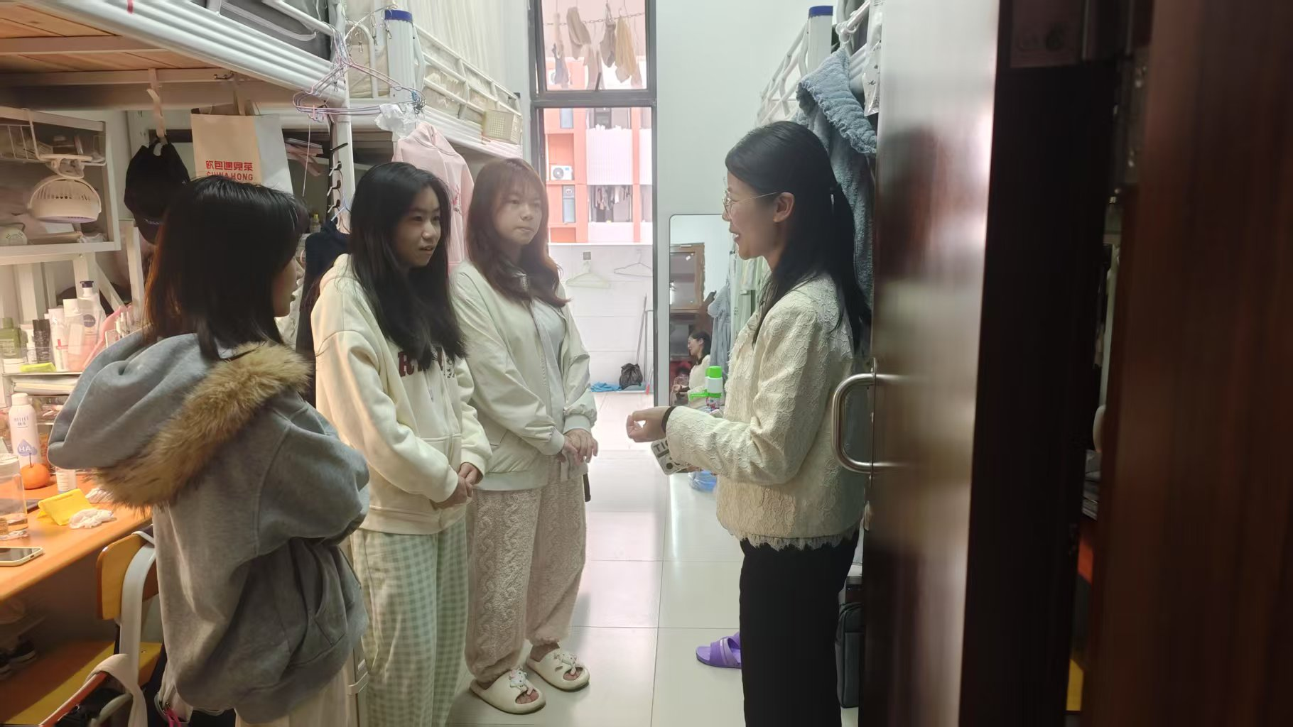 2025年3月20日周四下午4:50,学院党委副书记卢沛刁、辅导员及学生干部开展宿舍消防安全检查,重点排查易燃物品存放、烟头隐患、电路安全等问题隐患,并及时提醒学生提高安全意识。除专项检查以外,学院定期每周二晚上对学院宿舍开展“地毯式”巡查与“班级交叉互查”相结合,实现安全隐患排查和宿舍管理覆盖到各个宿舍。
