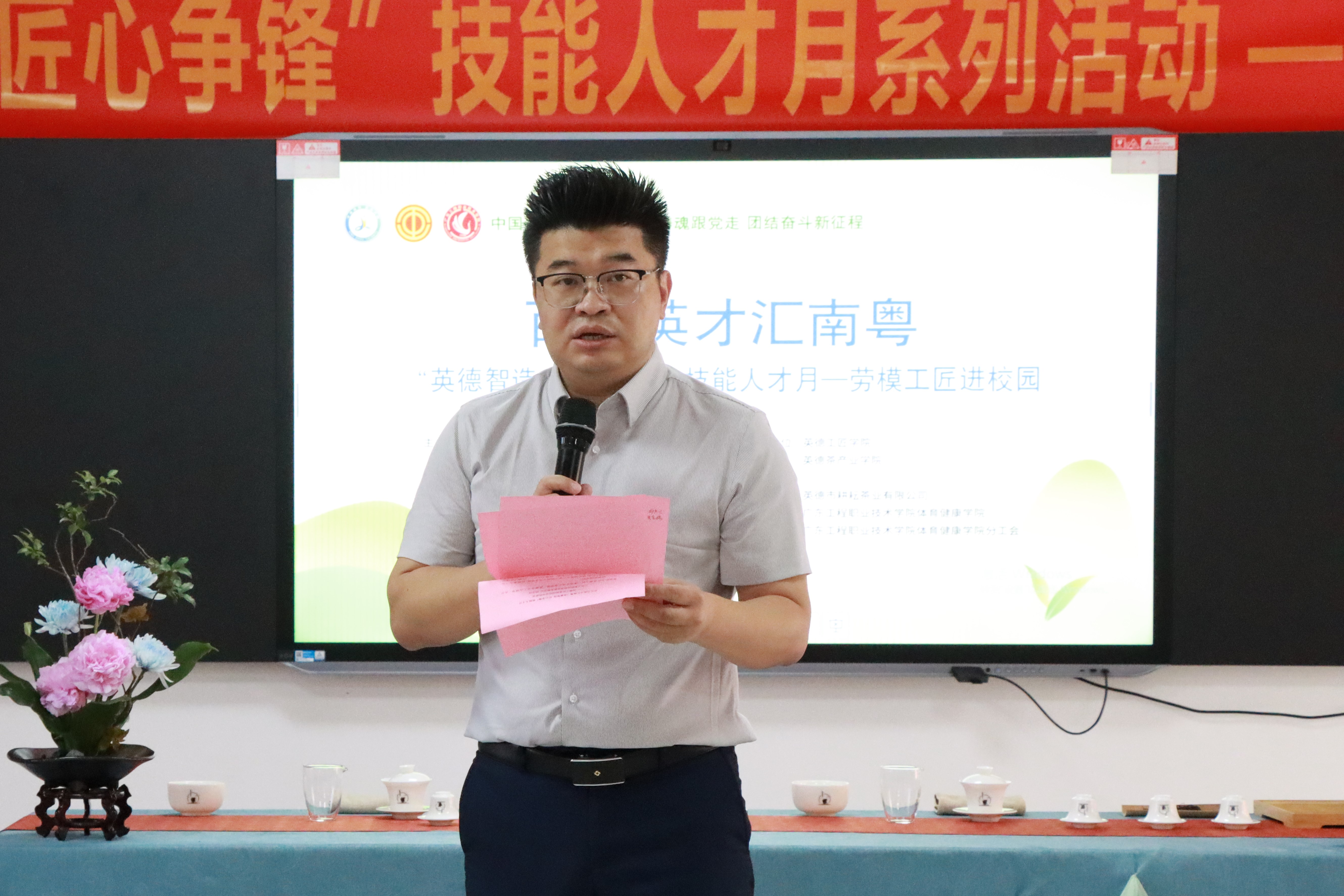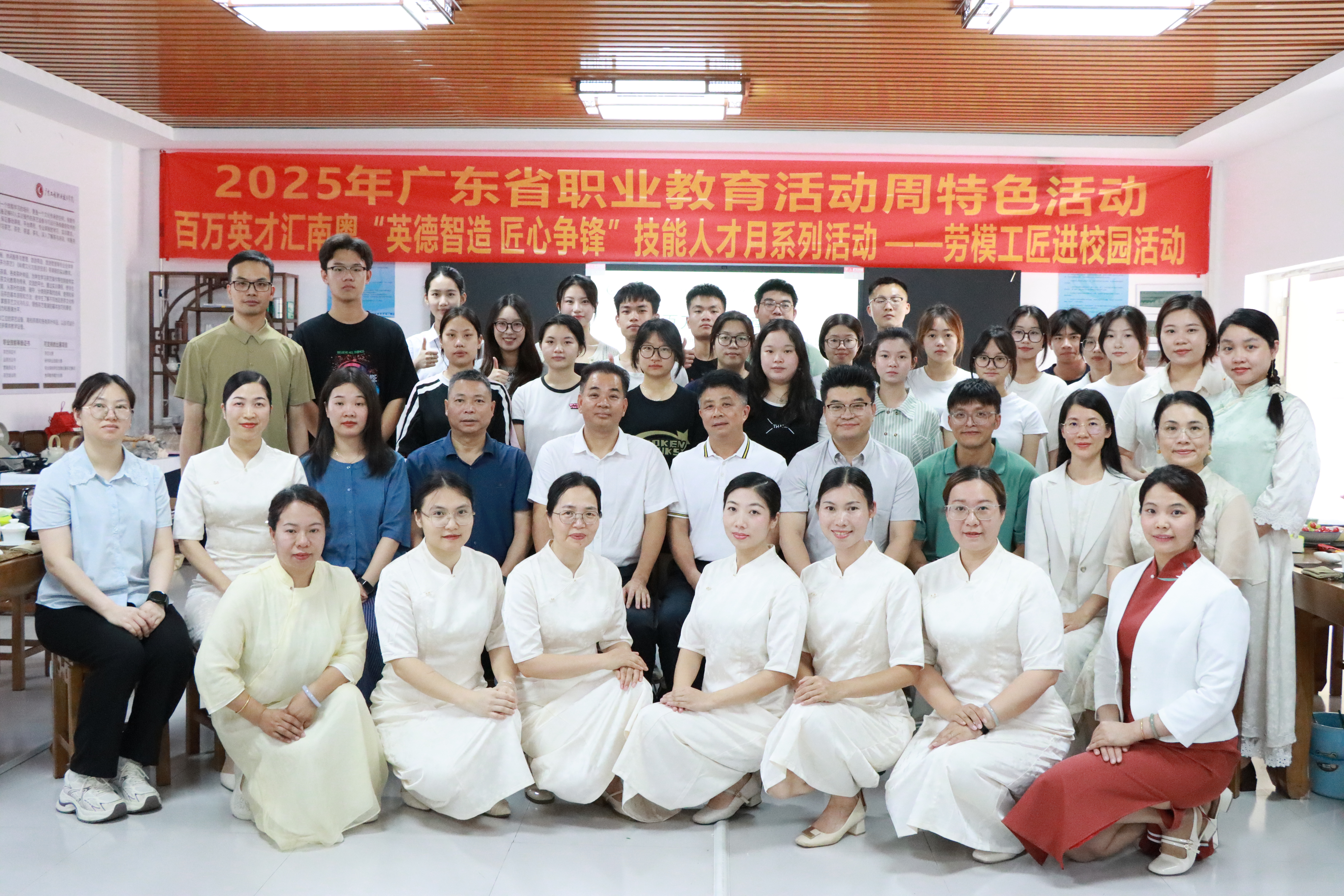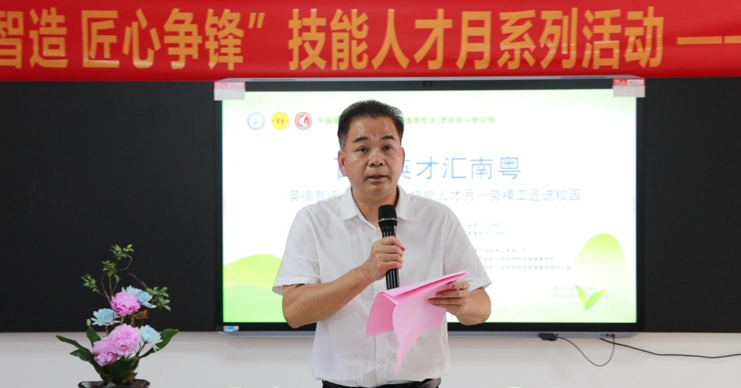 2025年5月15日下午,2025年广东省职业教育活动周特色活动:“百万英才汇南粤‘英德智造 匠心争锋’技能人才月——劳模进校园”活动在教学楼4-403茶艺室举办。清远市总工会副主席巫伯池,英德市人大常委会副主任、市总工会党组书记、主席丘文彪,广东工程职业技术学院体育健康学院党委书记邱志远,清远市总工会组宣部部长冯绍文,英德市总工会党组成员、办公室主任徐小容,广东工程职业技术学院学生工作部副部长李家标,体育健康学院党委副书记卢沛刁,广东省劳动模范张扬娣、高级工程师林敏玲等领导嘉宾与80余名师生齐聚一堂,共赴“茶香与匠心”之约。