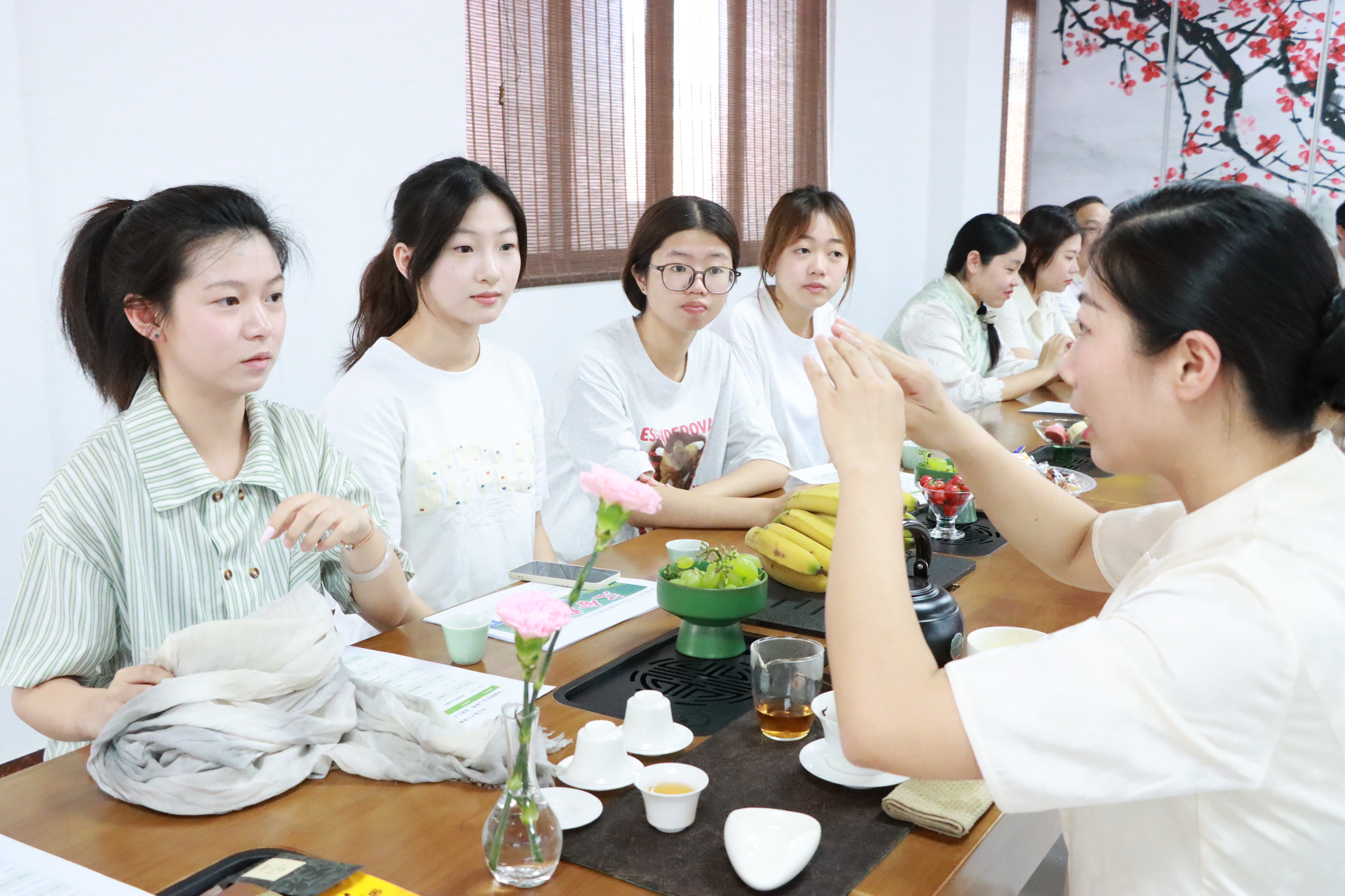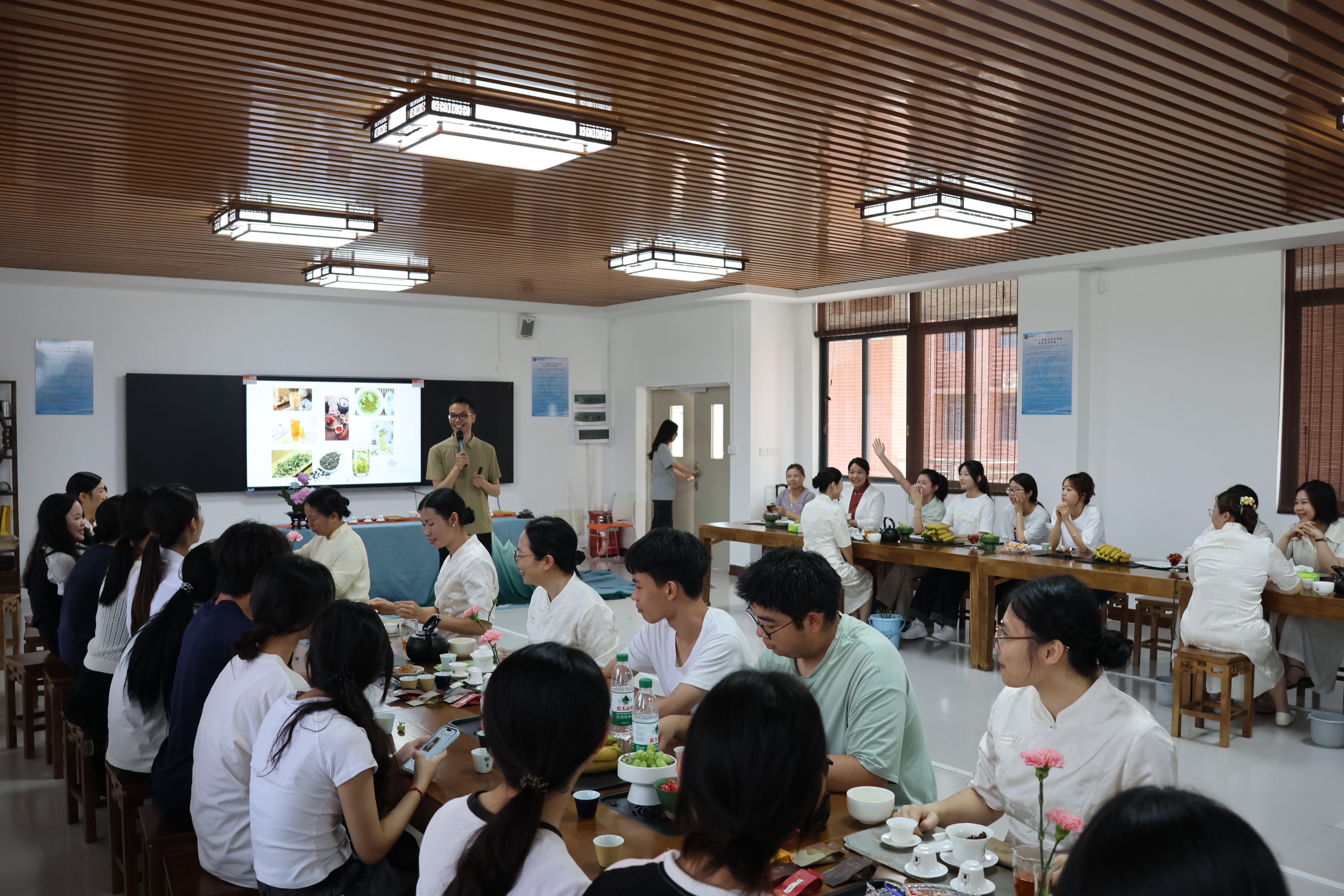 在红茶文化沉浸式体验环节,劳模工匠和茶艺师通过播放红茶宣传视频、现场讲解茶叶种植制造工艺,引导师生品试红茶,广东省劳动模范张扬娣等茶艺师献上行云流水的茶艺表演,诠释传统茶文化的雅致内涵;生活茶礼演示聚焦茶具使用、倒茶品茶规范,推动传统礼仪在生活场景中的实际应用。同时,以茶为媒,搭建校企交流桥梁,企业提出岗位需求和发展方向,学生提出实习就业想法和努力目标,在交流中深化师生对“技能成才”路径的理解。师生与嘉宾围绕“茶文化创新表达”、“茶健康产业趋势”、“茶行业岗位需求”等话题深入交流,形成“理论认知—实践体验—职业规划”的完整闭环。
