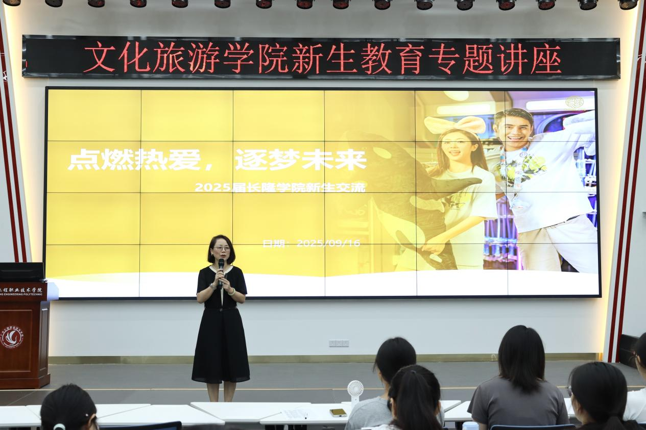 9月16日的专业教育环节是本次入学教育的亮点之一。学院特邀广东长隆集团有限公司培训与发展总经理兼珠海度假区人力资源负责人、长隆学院企业院长何莉女士为新生开展“文旅行业发展与职业生涯规划”专题讲座,让新生深入了解文旅行业发展趋势和就业前景,为他们的职业规划提供了专业指导。