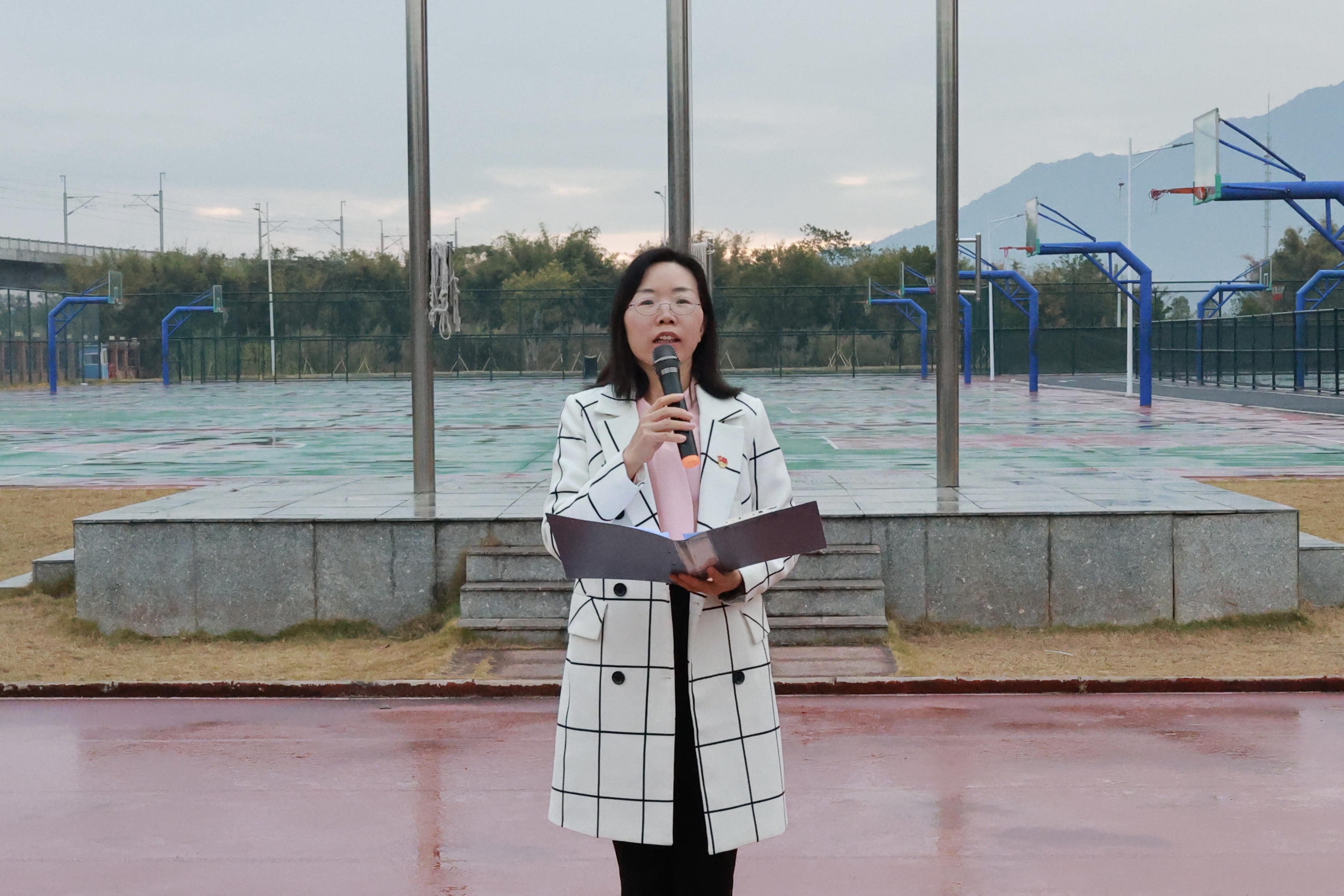 晨曦微露,国旗仪仗队迈着铿锵步伐护送五星红旗入场。伴随着雄壮激昂的《义勇军进行曲》,鲜艳的五星红旗缓缓升起、迎风飘扬,全体人员肃立行注目礼,齐声高唱国歌,赤诚的爱国之情在晨曦中涌动,嘹亮的歌声响彻校园。
