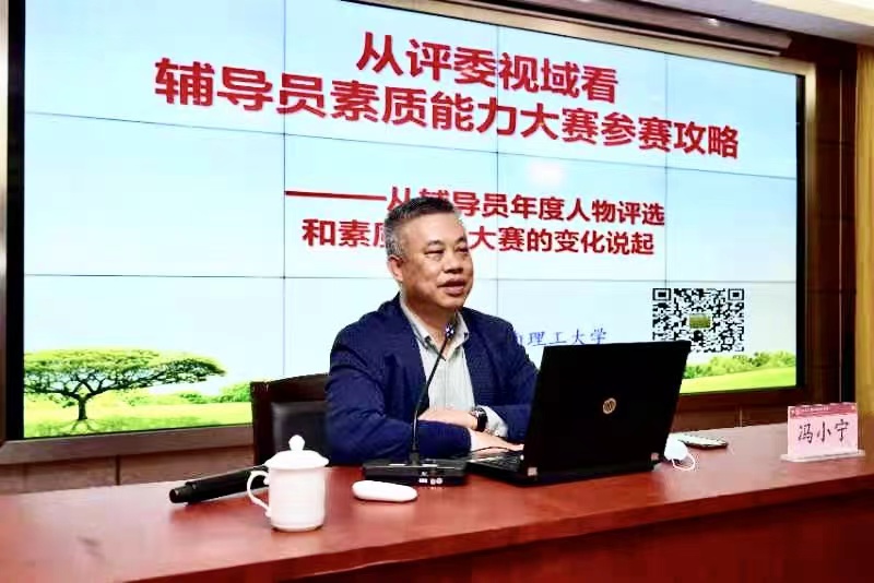 广州科技职业技术大学党委书记、华南理工大学硕士研究生导师、教育部高校辅导员培训和研修基地兼职教授、辅导员专项实践博导冯小宁作题为《从评委视域看辅导员素质能力大赛参赛攻略——从辅导员年度人物评选和素质能力大赛的变化说起》的专题培训,冯小宁以辅导员年度人物评选趋势和辅导员素质能力大赛变化为切入点,从全国辅导员素质能力大赛方式的改变看辅导员队伍建设趋势,对案例分析、谈心谈话等环节作了重点分析。他强调,工作是检验比赛成果的舞台,比赛是检验日常工作的舞台,作为辅导员责任重大,要主动学习,勤于思考,善于总结,不断提升职业素质能力。