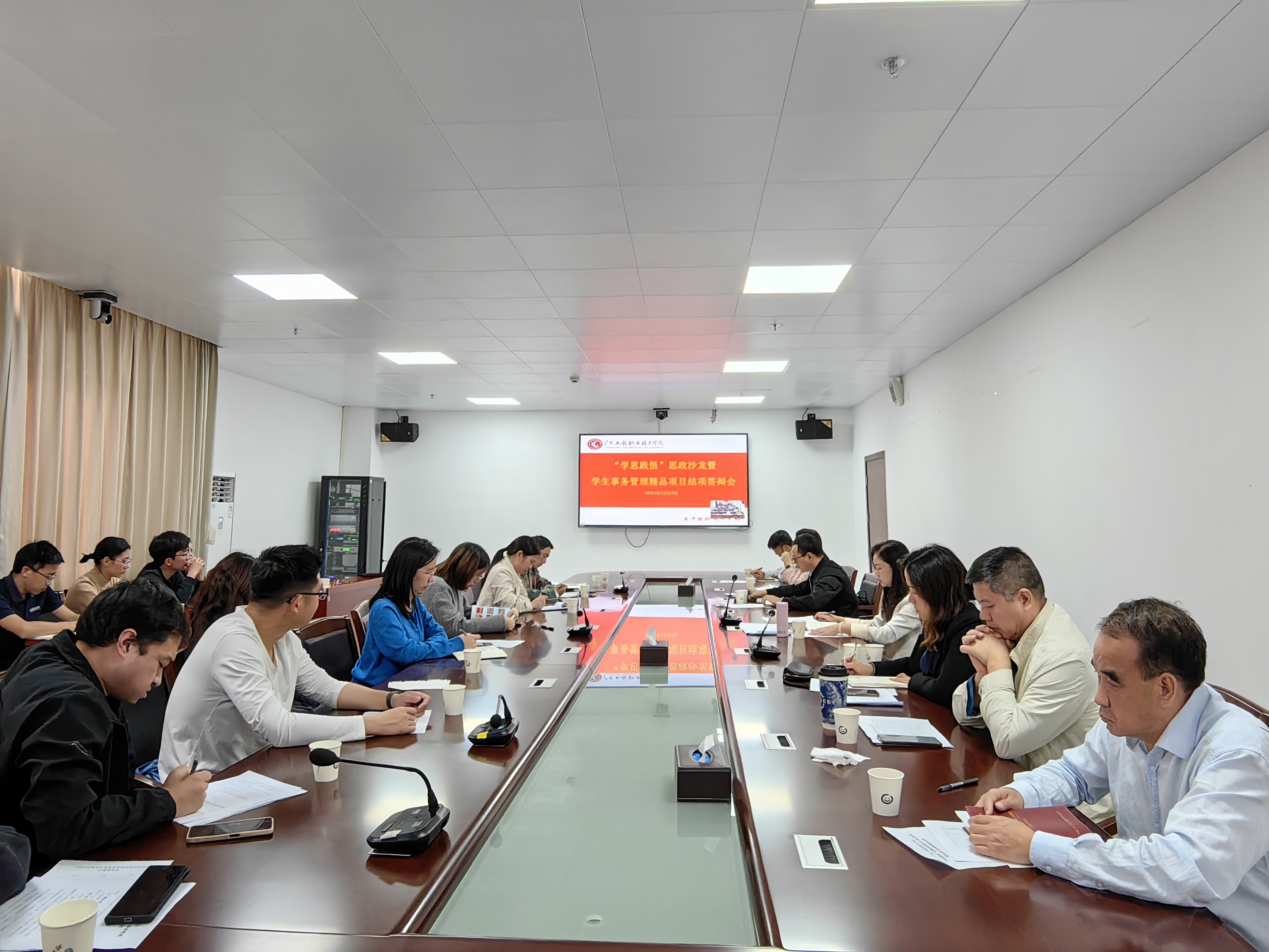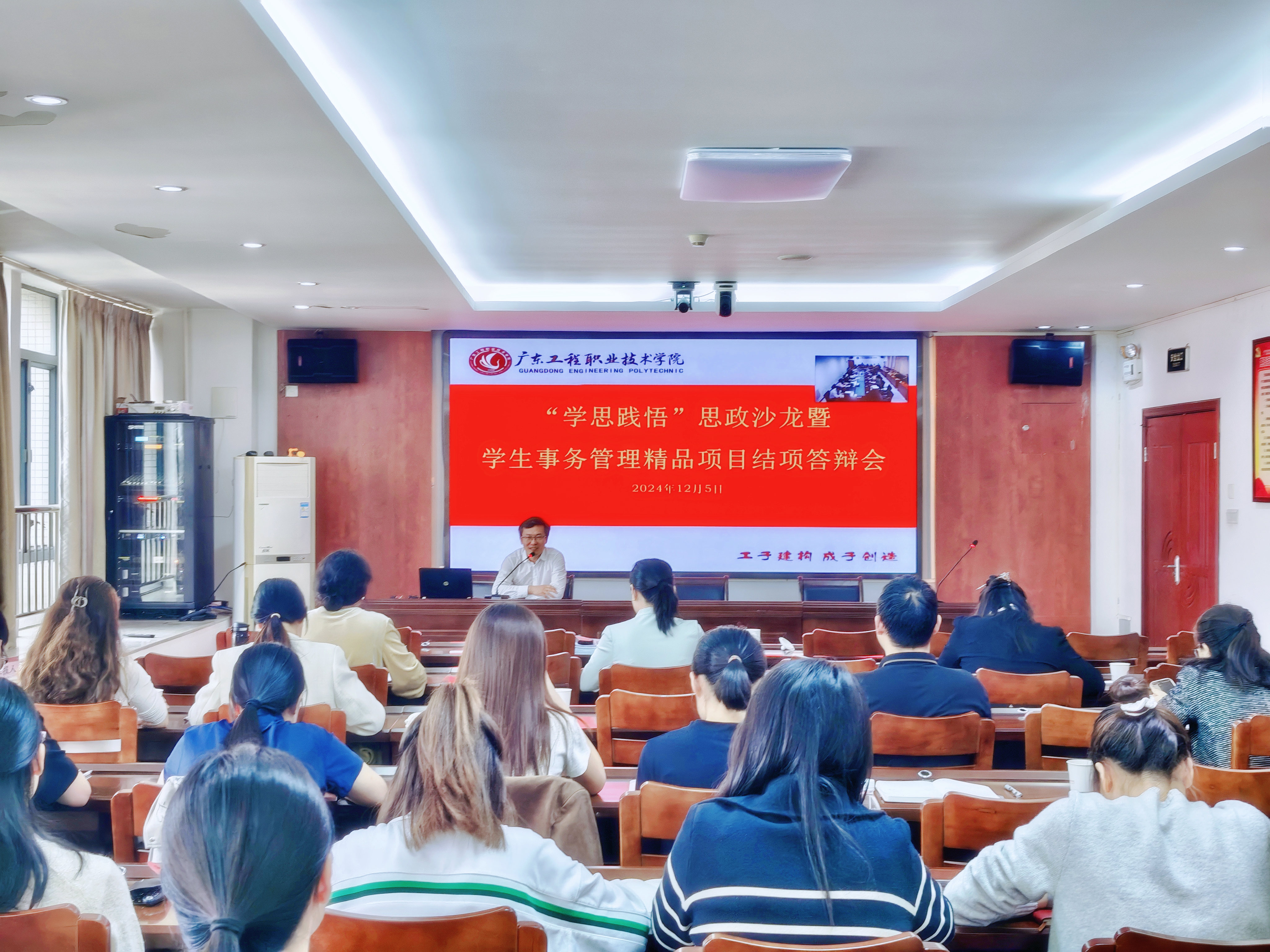 12月5日下午,我校“学思践悟”思政沙龙暨学生事务管理精品项目结项答辩会在广州校区办公楼511室、省职教城校区办公楼509室连线举行,学校副校长张小广出席并讲话,各二级学院党委书记、副书记、全体辅导员,学生工作部全体成员参会,会议由学生工作部(招生与就业指导中心)副部长曾婉玲主持。