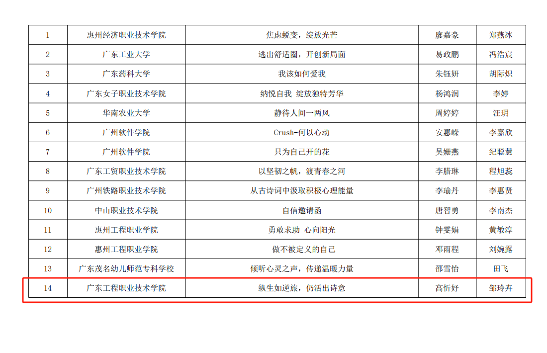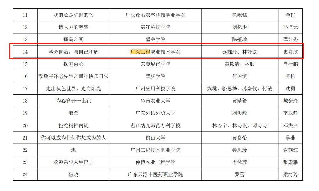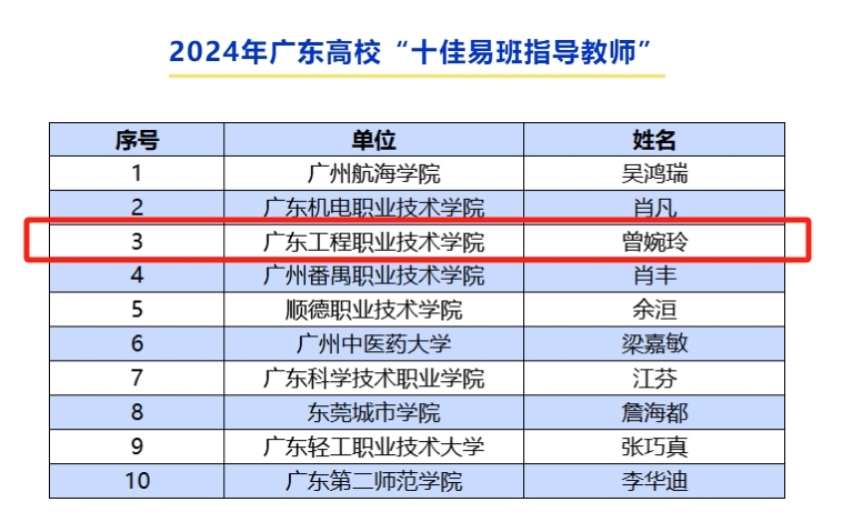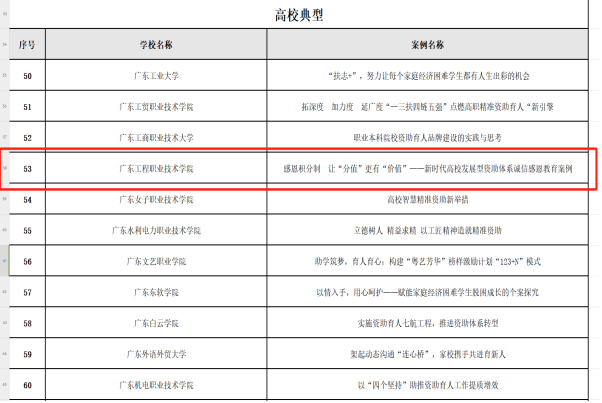 在资助工作方面,广东省教育厅发布2024年度广东省学生资助典型获奖名单中,由建筑工程学院辅导员龙洁爽老师撰写的资助育人工作案例《感恩积分制 让“分值”更有“价值”——新时代高校发展型资助体系诚信感恩教育案例》获评全省“学生资助工作案例典型”,财经学院辅导员李夏妍老师获评全省“学生资助工作者典型”。