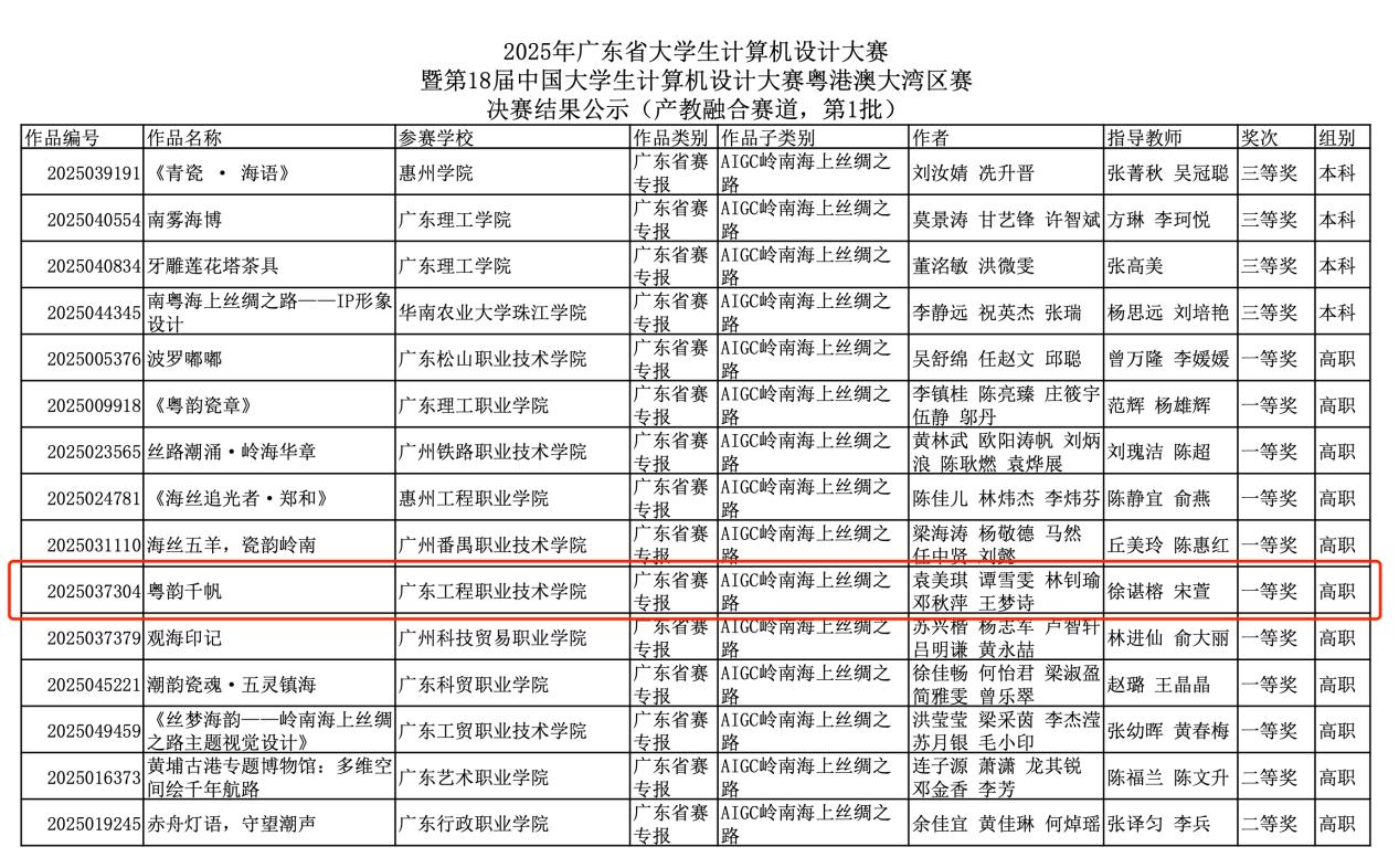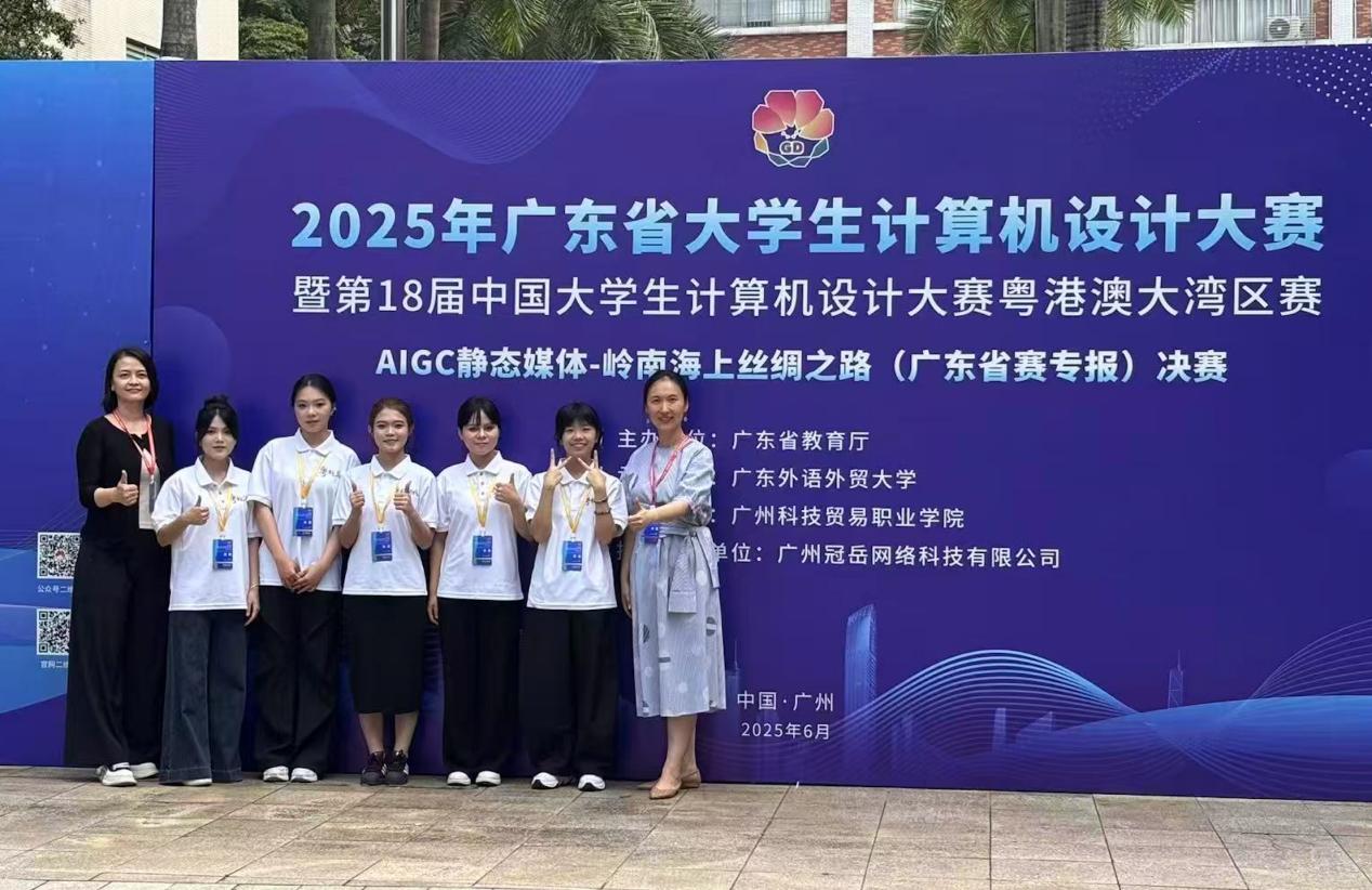 6月7日,由2025年广东省大学生计算机设计大赛暨第18届中国大学生计算机设计大赛粤港澳大湾区赛“AIGC静态媒体-岭南海上丝绸之路”(广东省赛专报)决赛中,艺术设计学院徐谌榕、宋萱老师指导的学生作品《粤韵千帆》(参赛学生:袁美琪、谭雪雯、林钊瑜、邓秋萍、王梦诗),凭借“AI+文化+手工艺”的创新模式,推动岭南海上丝绸之路“粤剧文化”的创造性转化与传播,从高职组27支现场决赛队伍中脱颖而出,一举斩获全省一等奖。