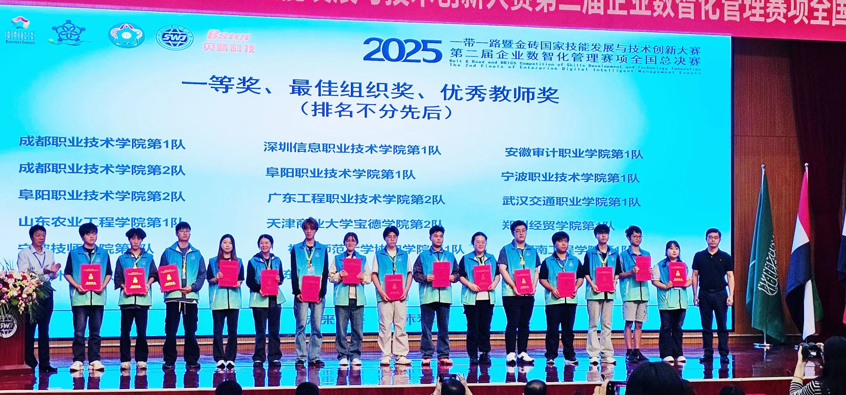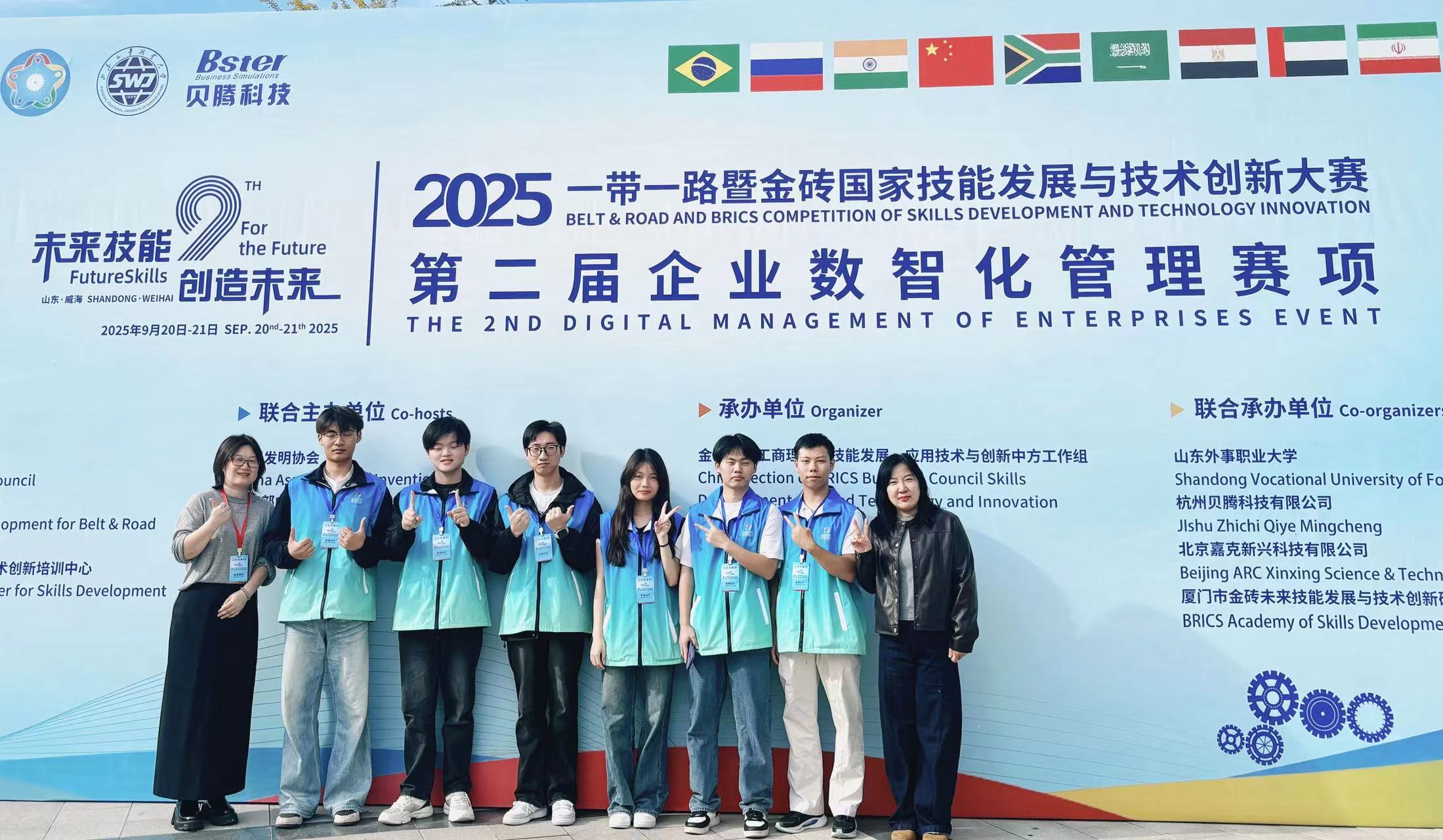 “2025一带一路暨金砖国家技能发展与技术创新大赛第二届企业数智化管理赛项总决赛”于2025年9月20-21日在山东外事职业大学成功举办。本次大赛共有667支队伍参加选拔赛,其中共有150支队伍从选拔赛中突围,进入总决赛。我校财经商贸学院胡延华和徐娟玲老师指导的两支参赛队伍(参赛学生:何平、钟锐源、陈润原、叶凌意、林健达、刘汝银)经过激烈角逐,从150支总决赛队伍中脱颖而出,分别斩获国赛一等奖和三等奖。