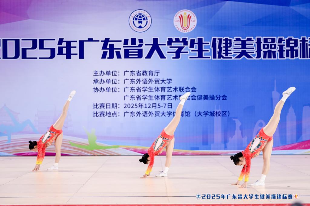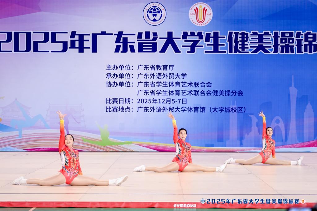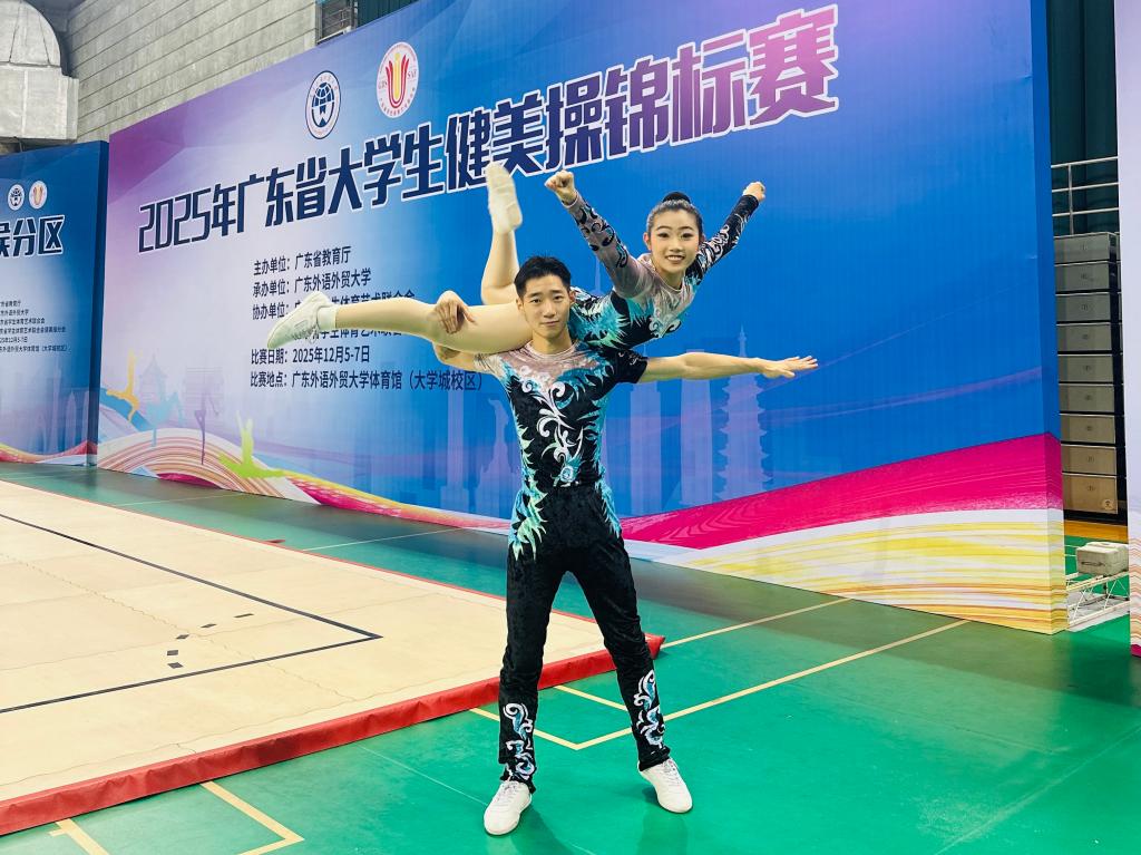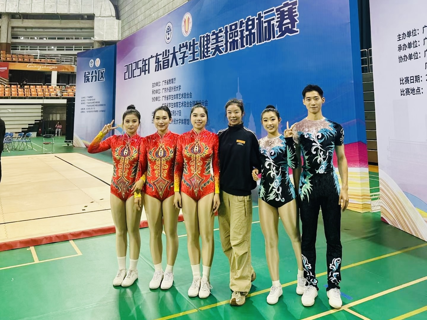 12月5日至7日,由广东省教育厅指导、广东省学生体育艺术联合会主办的2025年广东省大学生健美操锦标赛,在广东外语外贸大学大学城校区体育馆顺利举行,共有省内高校52支代表队754名选手参加角逐。此次赛事,我校派出5名学子出征,由周琳院长带队,张菊香、郭晓静两位老师担任指导教练。赛场上,队员们身着统一赛服,以饱满的热情、昂扬的姿态投入每一项比拼,我校学子不负众望,在仅有5名队员参加比赛的情况下一举拿下丙组团体总分第五名的成绩,还获得两个项目第三名及三个项目第四名的成绩,用实力在赛场上绽放青春光彩!
