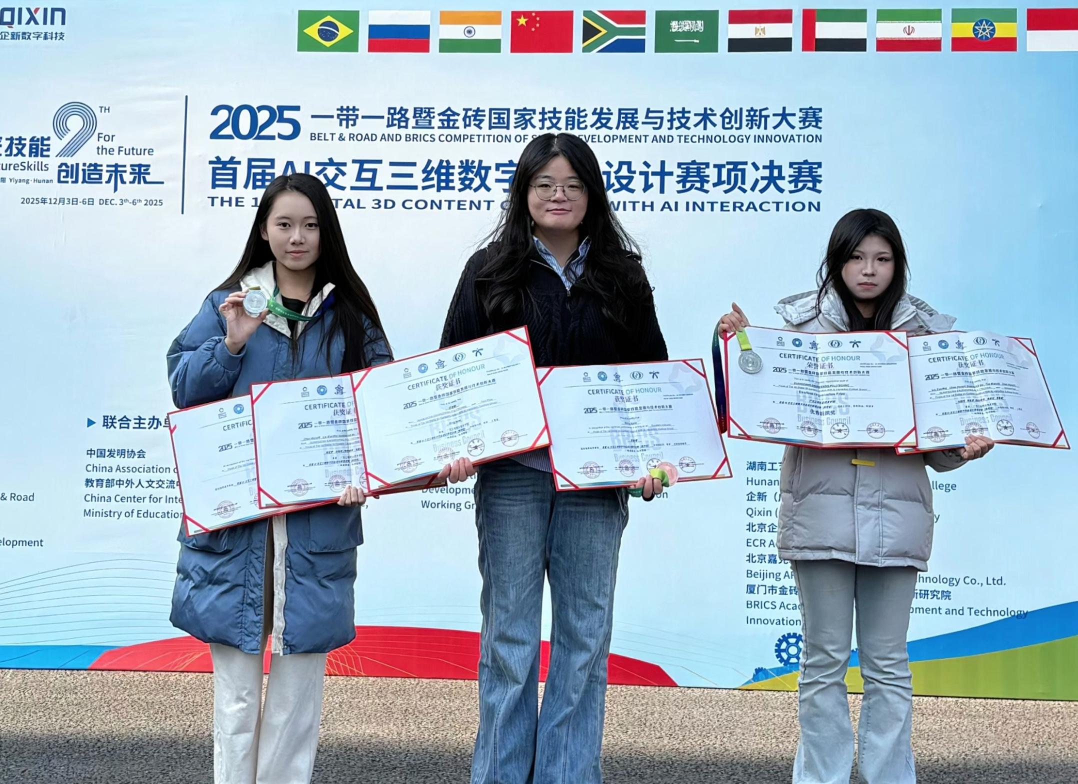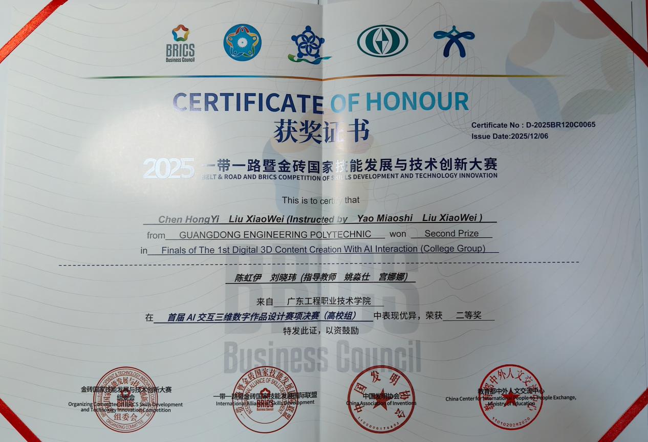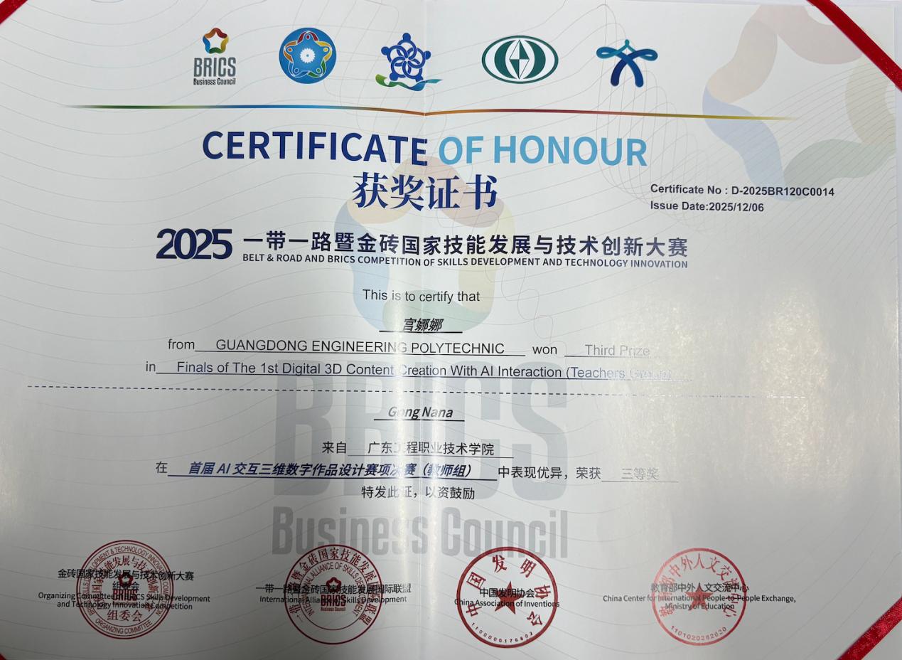 “一带一路”暨金砖国家技能发展与技术创新大赛是展示各国职业教育成果、促进技术交流与合作的重要国际平台。在2025年大赛中,我校艺术设计学院师生积极参与、勇于创新,在多个赛项中表现突出,共荣获二等奖4项、三等奖3项,充分展现了学院在“AI+设计”领域的教学成果与创新能力。