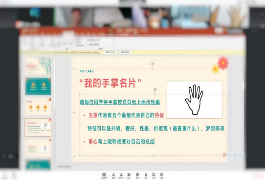 本次线上心理沙龙充分结合绘画心理疗法开展。绘画心理疗法是心理艺术治疗的方法之一,是让绘画者通过绘画的创作过程,利用非言语工具,将潜意识内压抑的感情与冲突呈现出来,达到我们了解自己、释放自己、欣赏自己的疗愈效果。沙龙分为四个环节,通过“手掌名片”环节让参与的同学相互认识,组建了支持性的团队;“疫情下的我们”执笔绘画环节中同学们将在疫情期间的经历、感受和想法通过绘画的形式无保留的呈现出来;“画作添一笔”环节引导同 学发掘疫情下的生活积极事件,寻找生活希望和掌控感。最 后,“团体分享”环节中,每位同学都通过一句话分享了参 与本次活动的感受与想法,进行团队分离与告别。