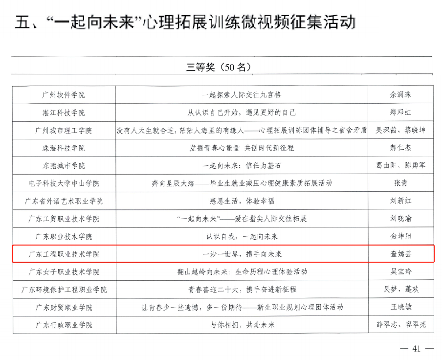 在 “一起向未来”心理拓展训练微视频征集活动中,查嫣芸老师的原创微视频作品《一沙一世界,携手向未来》荣获三等奖。