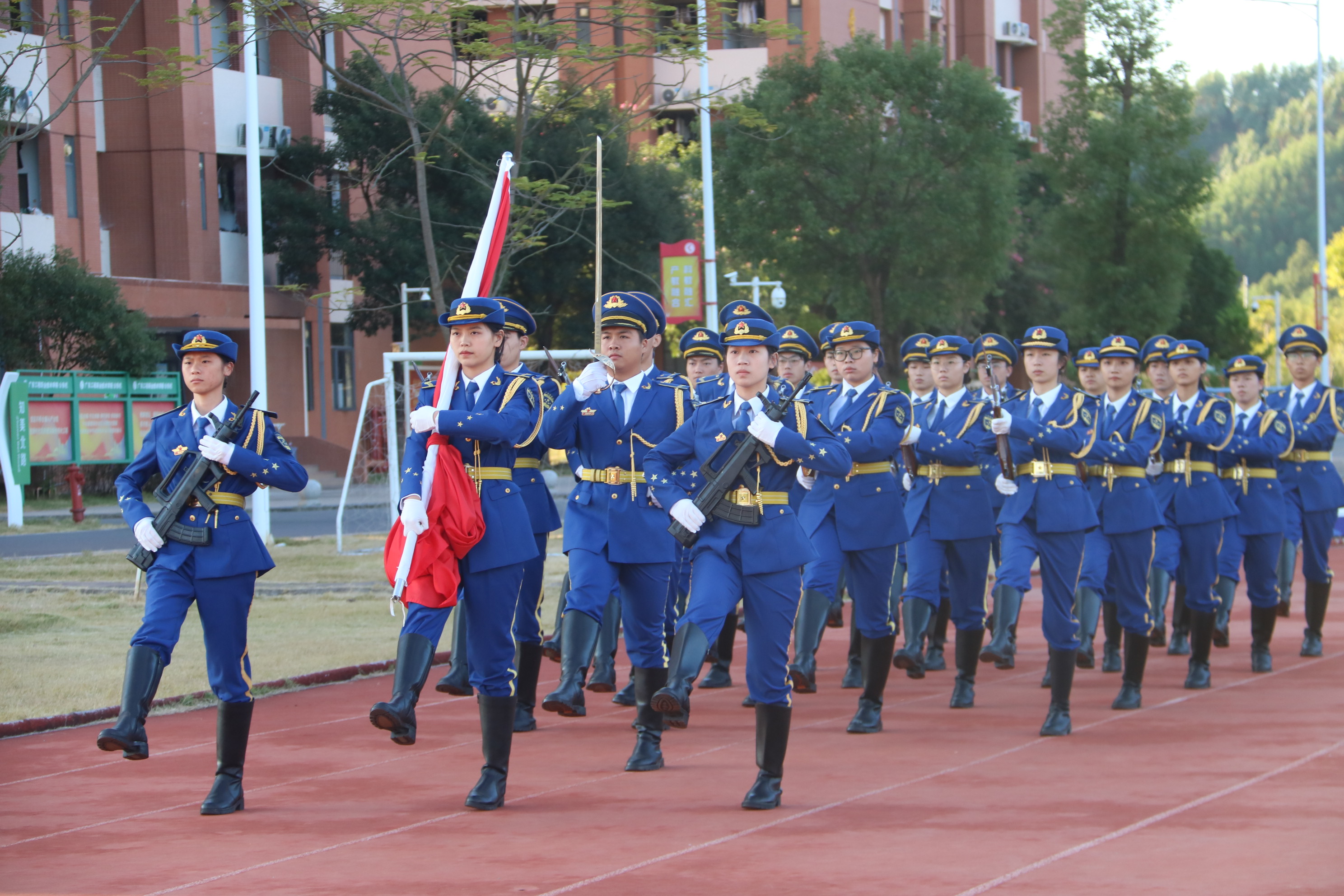 在全体师生的注目下,国旗护卫队队员昂首挺胸,迈着铿锵有力的步伐护送国旗来到升旗台。微风拂面,全体师生行注目礼,五星红旗在《义勇军进行曲》中冉冉升起,迎风飘扬。