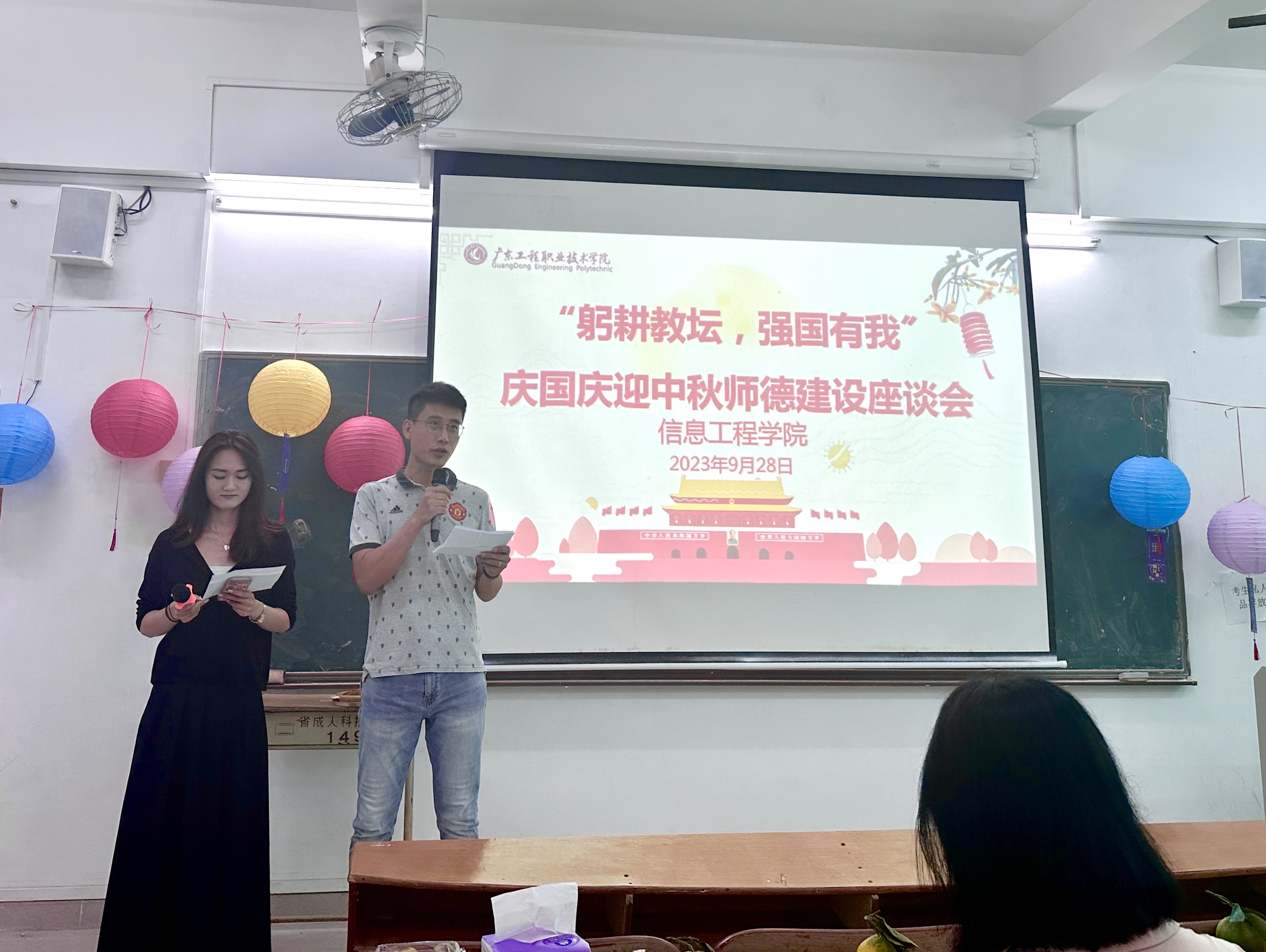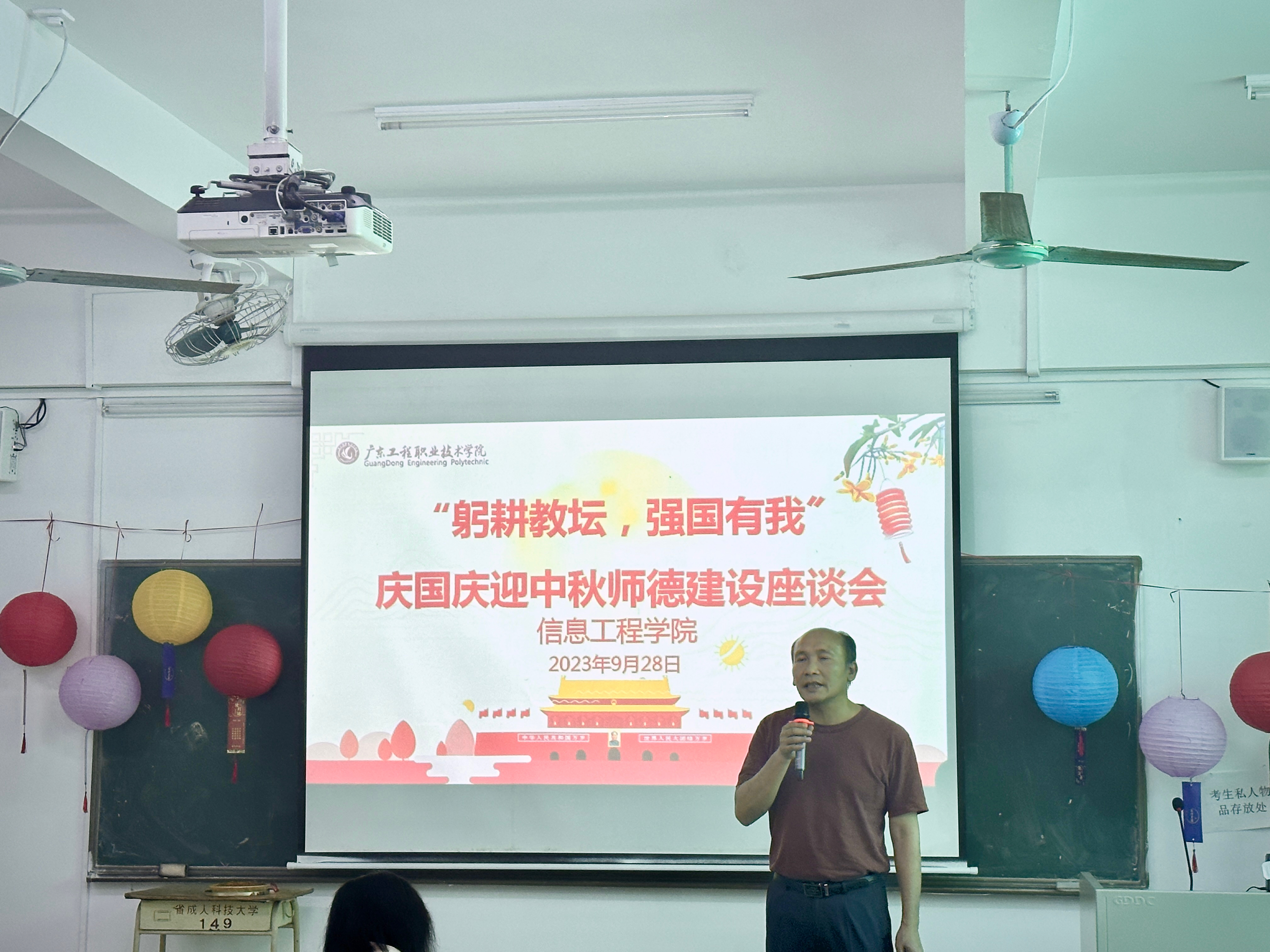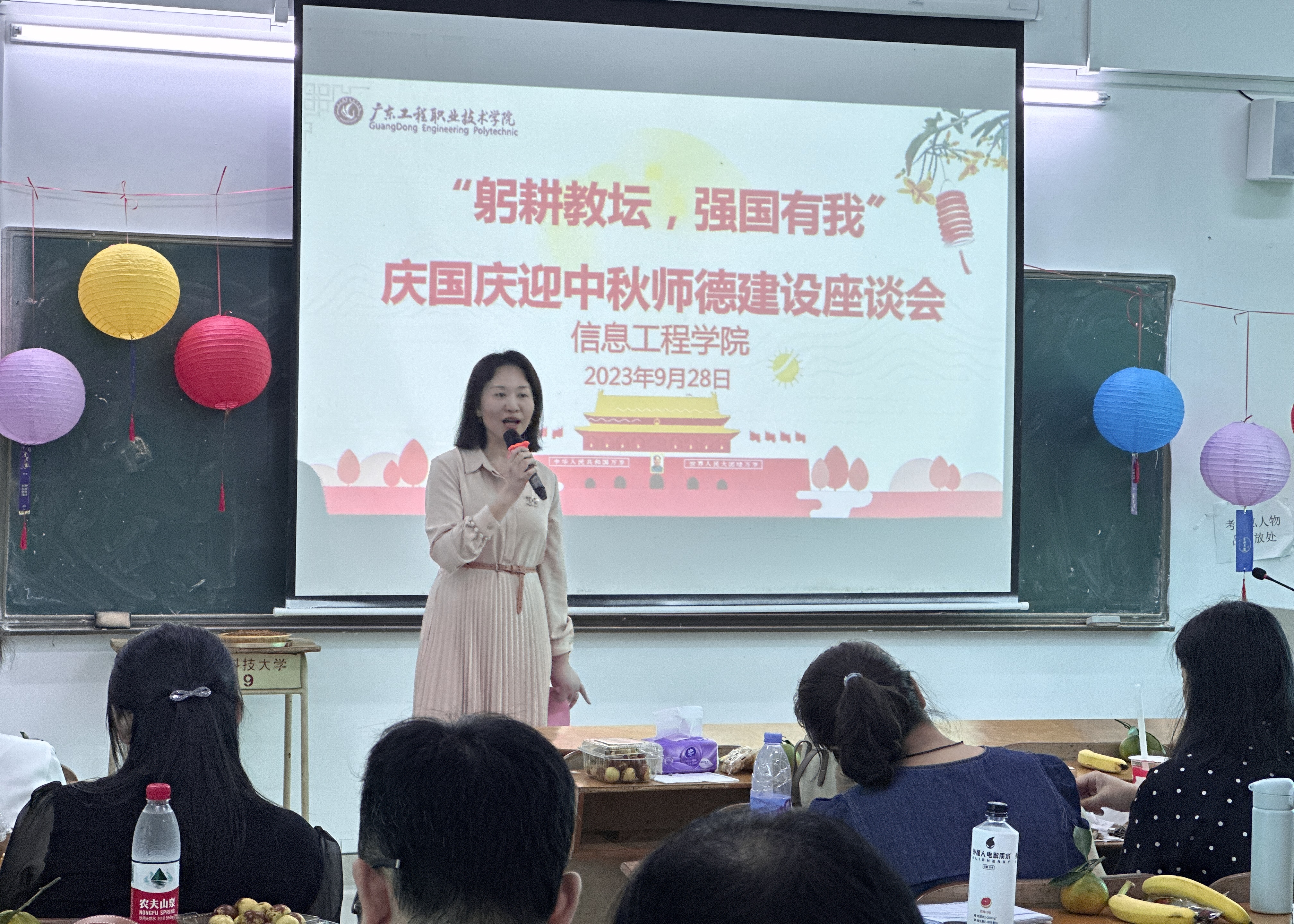 为促进新入职教师顺利融入信工大家庭,加强全院教师之间的深入交流,信息工程学院于9月28日中午成功举办了主题为“躬耕教坛,强国有我”庆国庆迎中秋师德建设座谈会。本次座谈会汇聚了全院教师,在节日到来之际,大家欢聚一堂,共同探讨心声,展望学校未来。学院利业鞑院长、桂爱民书记出席会议并发表讲话。