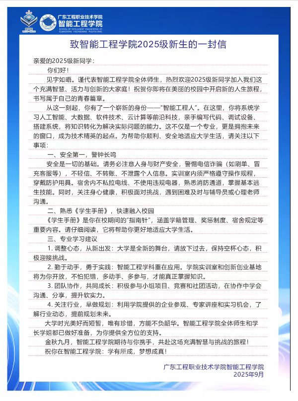 随着迎新工作圆满落幕,学院将按照学校统一部署,陆续开展理想信念教育、国家安全教育、心理健康教育、专业认知教育、职业生涯规划等一系列新生入学教育活动,帮助新生尽快适应角色转变,树立正确价值观,筑牢成长成才根基。未来,学院将秉承“智学笃信”的精神,全面落实立德树人根本任务,为培养更多具有家国情怀、全球视野、创新能力的信息技术人才而不懈奋斗!