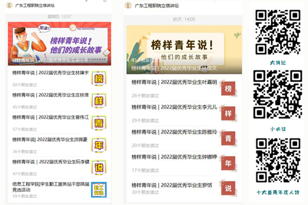 结合教育部办公厅关于在职业院校开展“技能成才 强国有我”主题教育,信息工程学院遴选36名优秀毕业生成为朋辈榜样,依托易班、“广东工程职院立信讲坛”微信公众号,策划“榜样青年说”主题,分6批次宣传推广优秀学生的典型事迹,用身边的优秀朋辈带动学生,引导推动学生发奋图强、健康成长。