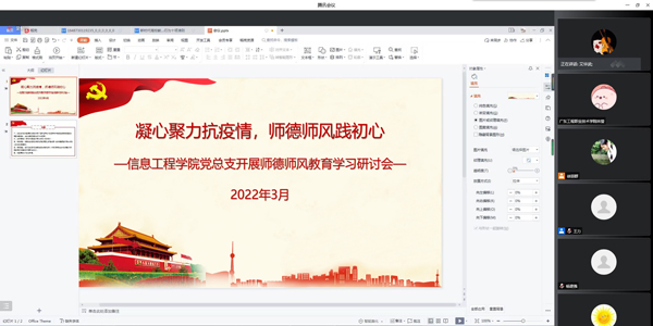 4月1日下午,信息工程学院党总支通过网络视频会议组织召开“凝心聚力抗疫情,师德师风践初心”专题学习会,全院全体教师参加。信息工程学院党总支副书记艾华武同志主持会议。