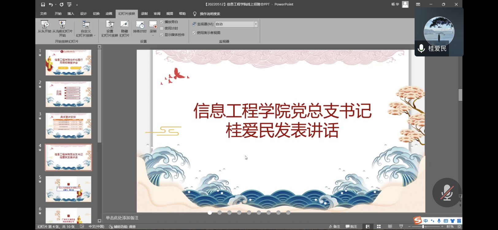 为更好落实广东省2022届毕业生就业创业工作第二次调度视频会议精神,加快促进信息工程学院毕业班学子就业,信息工程学院于5月12日上午9时举办了校园招聘网络宣讲会。信息工程学院党总支书记桂爱民、企业嘉宾、毕业班辅导员许焕坚、杨华老师和大二大三学生参与了本场网络宣讲会,会议由辅导员杨华主持。