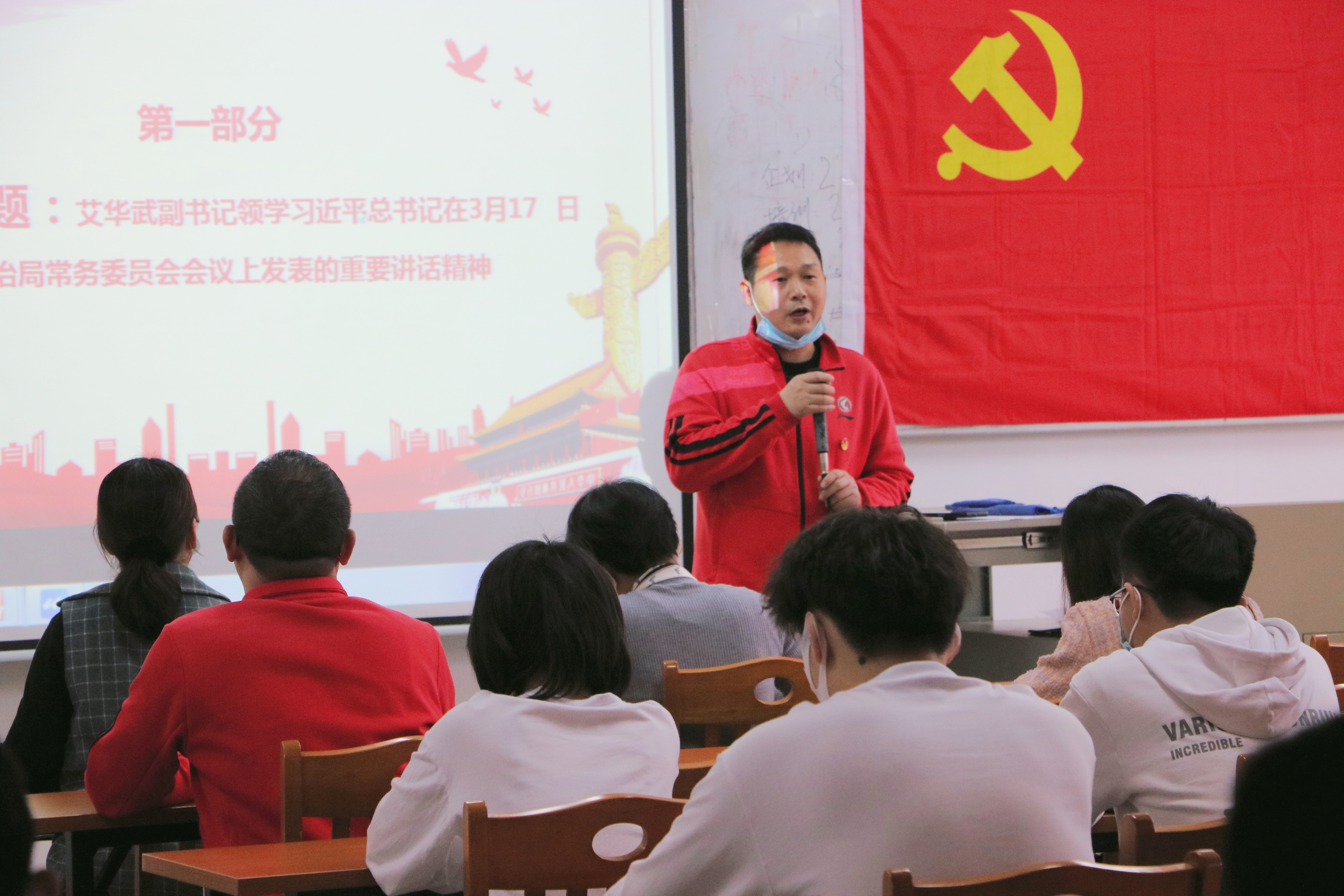 首先,由艾华武副书记领学《习近平总书记在3月17 日中共中央政治局常务委员会会议上发表的重要讲话精神》,他强调每个人都是自我健康的第一责任人,作为党员必须树立先锋模范作用,带动影响身边的同学、身边的群众,带头落实疫情防控措施。