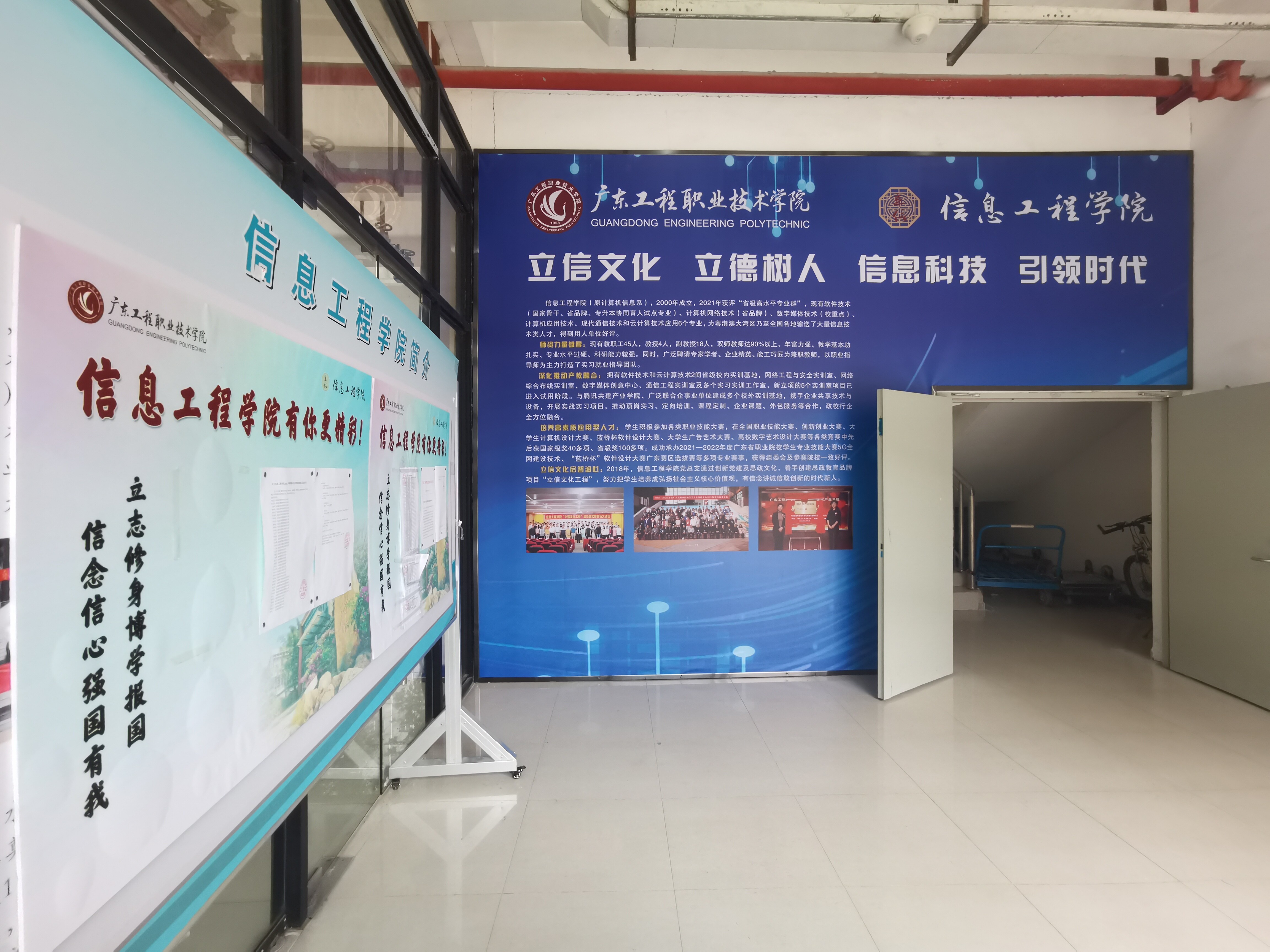 一楼展示深度合作企业、学院发展脉络、师生已获得的成就……站在科技楼大门,迎面宣传栏的科技蓝和信息工程学院的专业特色、信息科技因素等相互呼应。该学院原是计算机信息系,2000年成立,2021年获评“省级高水平专业群”,现有软件技术(国家骨干、省品牌、专升本协同育人试点专业)、计算机网络技术(省品牌)、数字媒体技术(校重点),计算机应用技术、现代通信技术和云计算技术应用6个专业,为粤港澳大湾区乃至全国各地输送了大量信息技术类人才,得到用人单位好评。