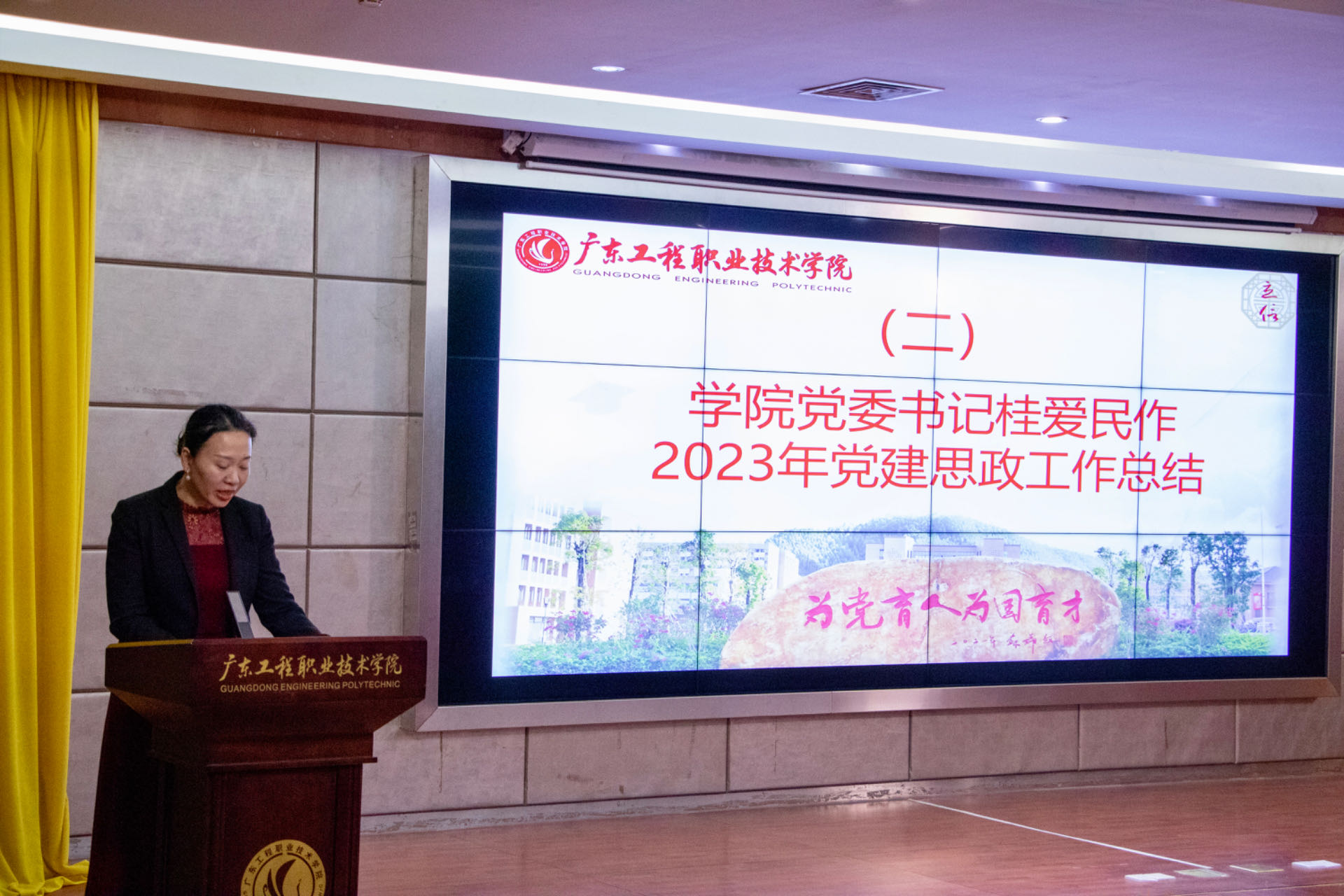 精彩纷呈的党建思政工作总结视频首先拉开了大会的帷幕,充分地展现了我院2023年度党建思政工作以及全体师生在立信文化工程引导下取得的成绩。随后信息工程学院党委桂爱民书记作2023年立信文化工作总结汇报,回顾了一年来全体师生在立信文化工程的引导下取得的成绩,并明确了新一年工作的方向:一是组织党委认真学习宣传贯彻党的二十大精神,开展主题教育。加强思想引领,把党的二十大精神落实到学校双高建设和立德树人各项工作。二是创建省级样板支部。要深入实施头雁工程“五个一”平台,通过“学生接待日”关爱行动以及创建最美党员示范岗,发挥党员教师示范引领作用。三是发挥党建引领、思政铸魂、文化育人的作用,全力构建“立信文化工程”党建思政文化育人体系。四是强化党建思政宣传工作,把握思想文化阵地。通过指导“最美信工坊”出宣传精品,加强对“立信讲坛”等宣传平台的创建力度,打造文化精品,弘扬立信文化。五是优化党员发展培育工作机制,提升党员发展质量,发挥引领作用。