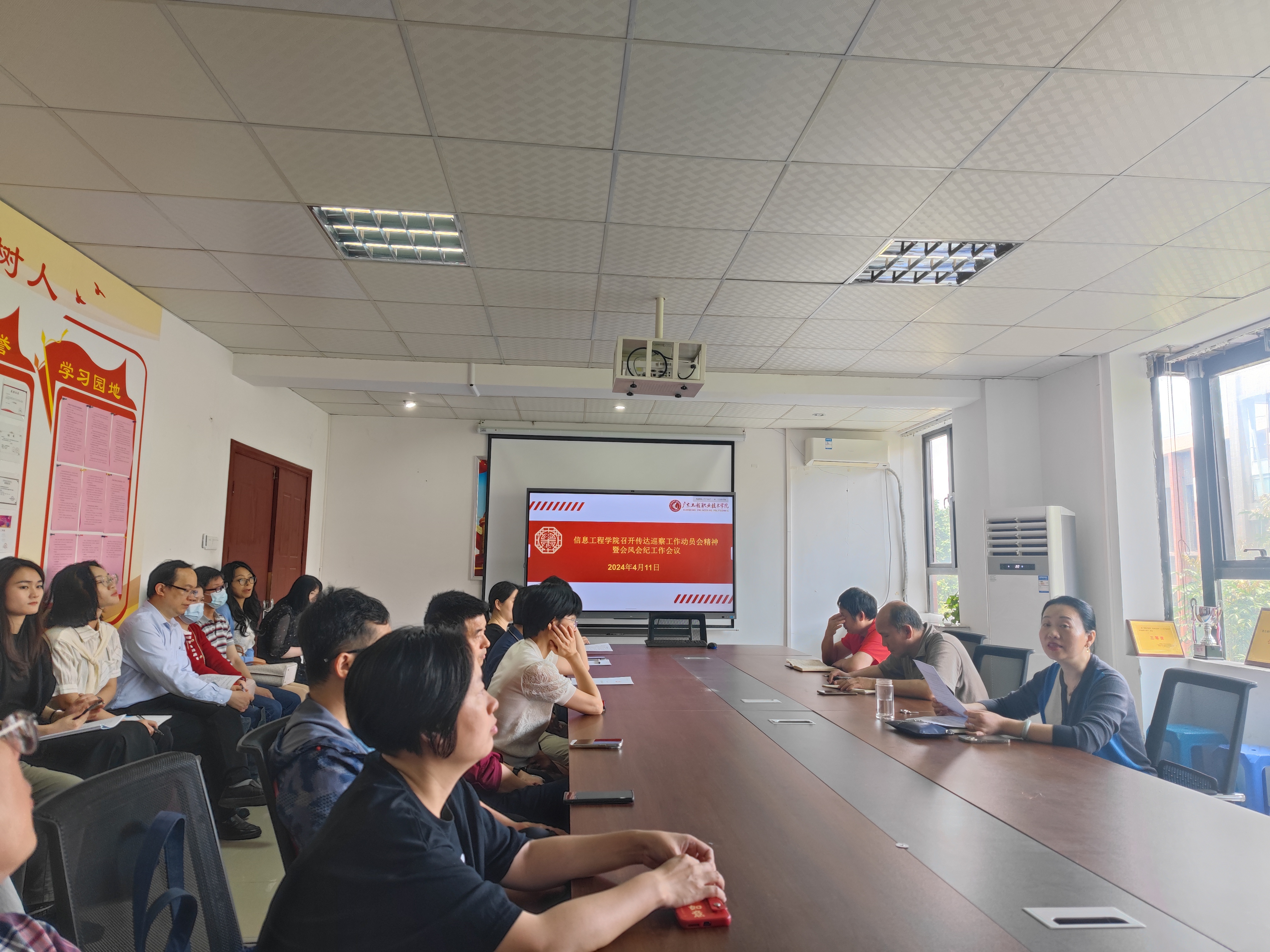 近日,信息工程学院召开传达巡察工作动员会精神暨会风会纪专题工作会议,旨在传达巡察工作动员会精神,强化会风会纪建设,确保学院专业建设和双高建设工作规范有序进行。全体教职工参加了会议,会议由党委书记桂爱民主持。