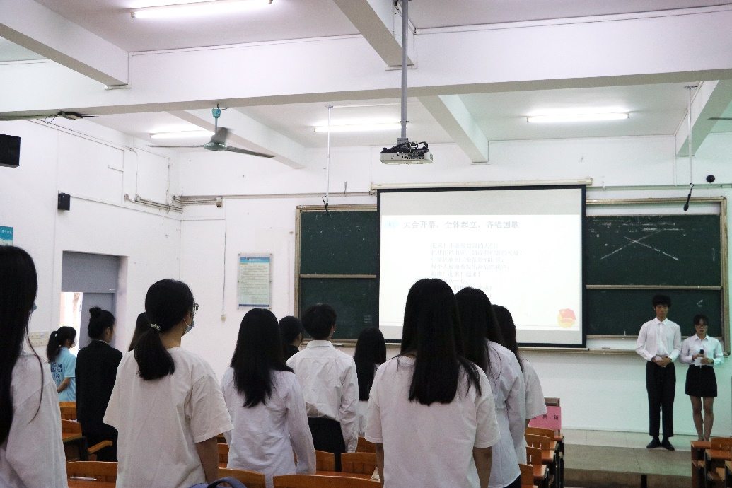 大会第一项,主持人介绍到会领导、老师,宣布第十四次学生代表大会正式开始,全体参会人员起立奏唱《国歌》。