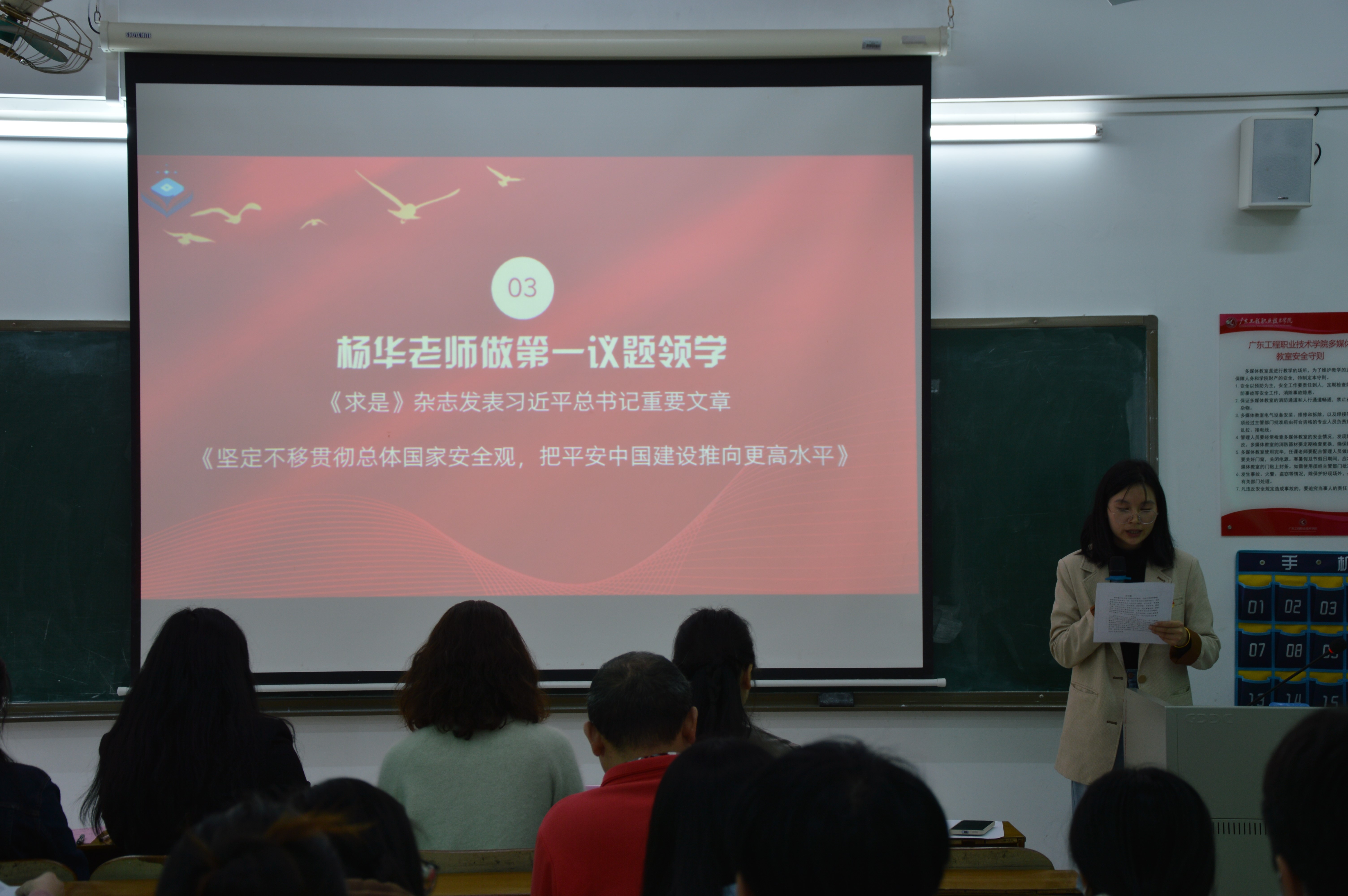 随后,杨华老师以“学习广东省高质量发展大会精神,贯彻总书记教育指示,赋能人工智能专业发展”为主题,为全体党员上了一堂生动的党课。她强调作为人工智能专业的学生,要不断深化专业知识学习,提高创新能力,为国家的创新驱动发展战略贡献力量。