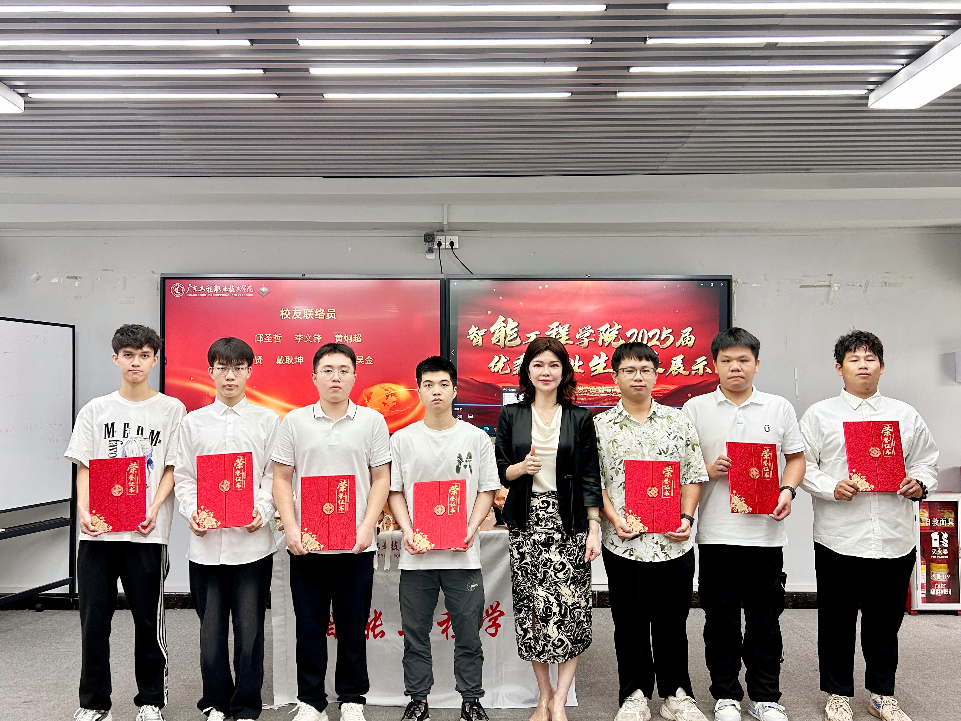 科技楼大门口展厅,历届校友合照下还留有学生们的手写祝福,“今日我以母校为荣,明日母校以我为傲”的横幅随风轻扬,与不远处刚揭牌的智能工程学院党委“红色驿站”暨“一站式”学生社区劳动教育实践基地遥相呼应。在这栋学生上课的科技楼604会议室,“智”向未来·青春启航2025届优秀毕业生座谈会温馨举行着。今年智能工程学院聘任19名班长为2025届校友联络员,搭建产业导师、实习推荐双通道。智能工程学院党委书记吴丽清为校友联络员颁发聘书,寄语校友联络员充分发挥沟通桥梁作用,把智能工程学院钻研新一代信息技术前沿的劲头继续发扬,为祖国科技建设发展写下青春最生动的注脚!