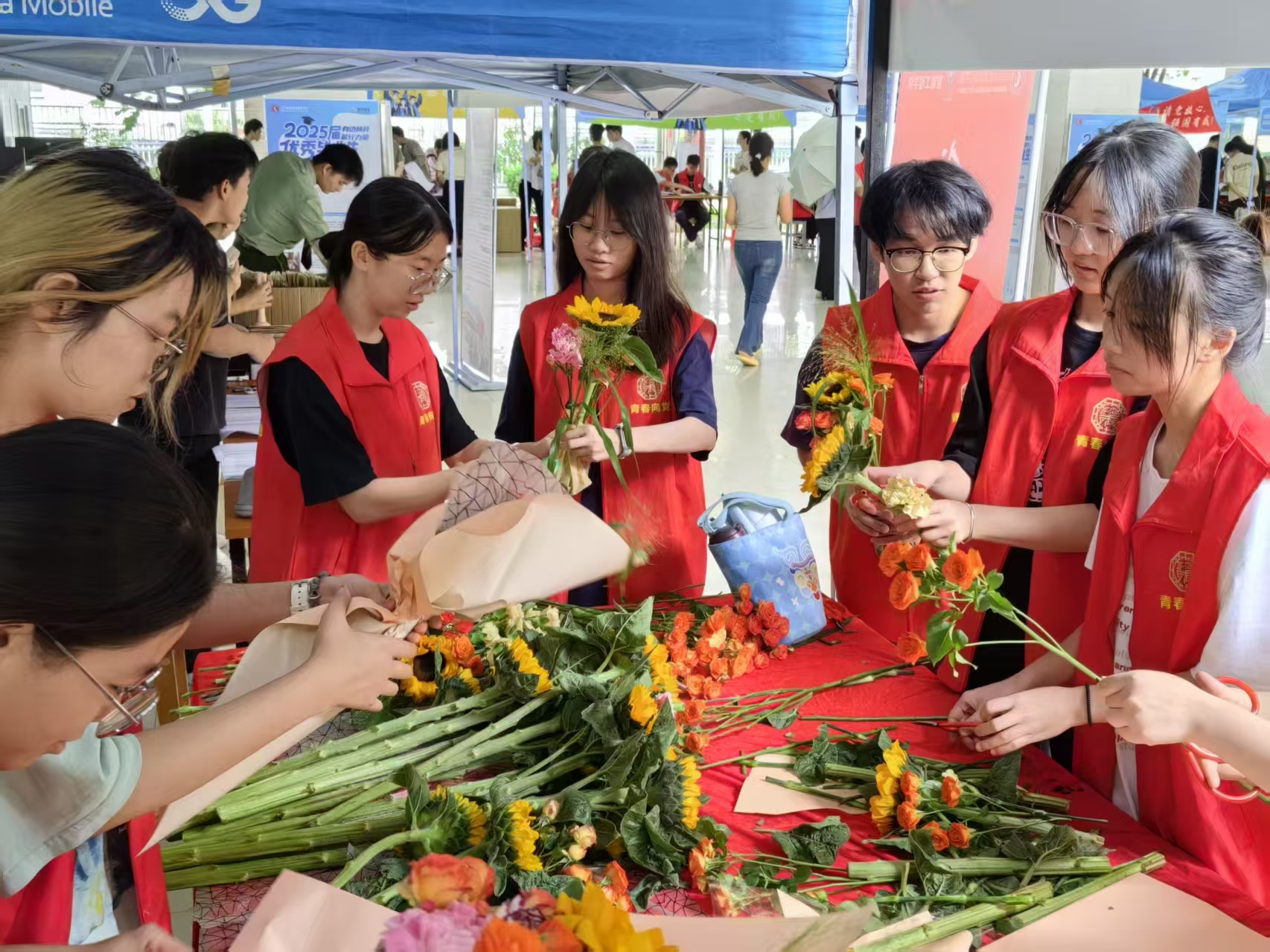 在科技楼架空层“一站式”离校大本营现场,学院设置“劳育育花育人 花点时间说再见”摊位,邀请毕业生亲手制作花束,以花寄情,将那些来不及诉说的感恩,融进一束亲手扎制的鲜花,并在优秀毕业生座谈会上亲手送给校园恩师。“我为群众办实事”“我为同学做实事”的展架鲜明站立着,也代表着智能工程学院全体教职工全心全意为学生办好事的坚定。“从退宿到领毕业证仅半小时,志愿者还帮我把三箱书送到快递站!”广州校区毕业生李同学感慨。智能工程学院打破部门壁垒,实现学工、教务、后勤6项手续一窗通办,毕业证发放实时追踪进度,更创新推出“1对1宿舍陪伴”——58名“暖橙志愿者”化身“移动服务站”,由学生党员、学生干部担任“服务专员”,协助毕业生打包行李、寄运物品,让温情在肩扛手提间流淌,“学习雷锋、奉献他人、提升自己”的志愿服务理念在不同年级之间传承。