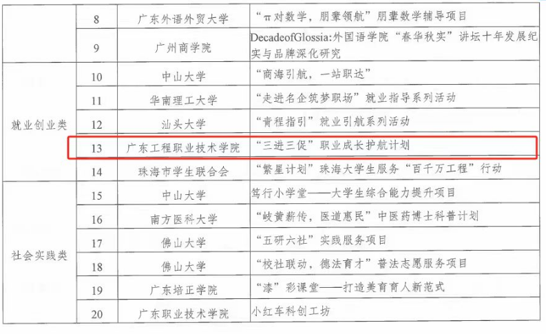 近日,广东省学生联合会发布 2025 年广东省高校学生会组织 “我为同学做实事” 服务项目案例征集活动结果揭晓,经资格审查、专家评审两轮严格遴选,我校智能工程学院学生会申报项目《“三进三促” 职业成长护航计划》脱颖而出,成功入选全省精品案例,我校是仅有的2所获此殊荣的高职院校之一。