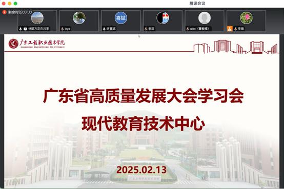 2月13日下午,现代教育技术中心通过腾讯会议召开专题学习会议,深入学习贯彻全省高质量发展大会精神,传达《中共广东省委办公厅、广东省人民政府办公厅印发〈广东省建设现代化产业体系2025年行动计划〉》及《广东省委书记黄坤明在广东省高质量发展大会上的讲话(全文)》精神,并结合现教中心重点工作任务,研究部署贯彻落实举措。会议由现代教育技术中心主任林明方主持,全体教职工参加会议,教职工代表做学习发言。