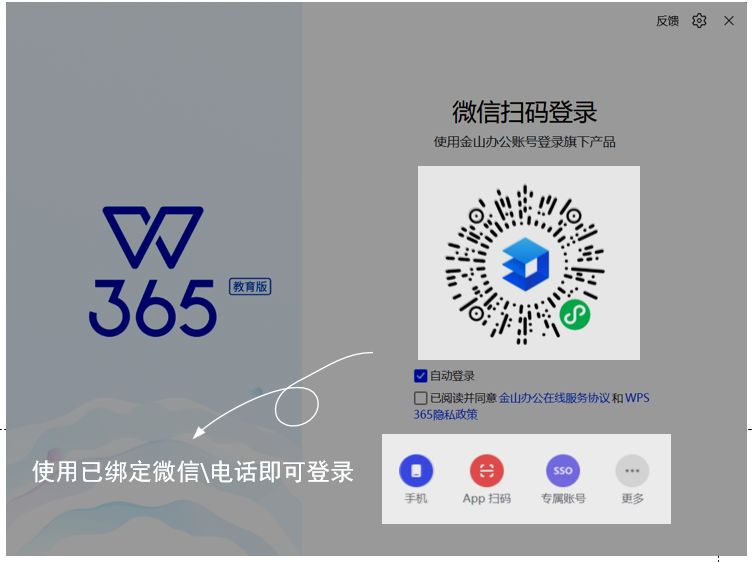 2.安装WPS365 教育版客户端后,用手机扫码,填写相关账号信息进行账号激活,或点击以下链接填写相关账号信息进行账号激活。登录后请绑定手机号/微信,方便下次快捷登录。