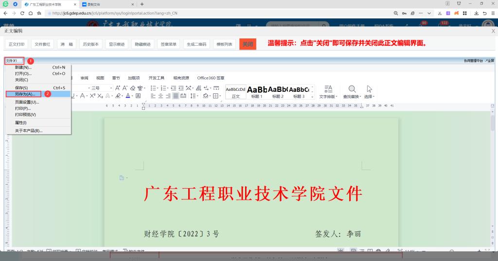 5.“一般请示”“院内机构发文”,在最后一步进入正文点击“清稿”并关闭保存,发布后就不会显示修改痕迹,所有发文不能直接下载,可通过复制粘贴或点击正文左上角的“文件”——“另存为”方式(如图-2所示)保存文本内容。(后期优化)