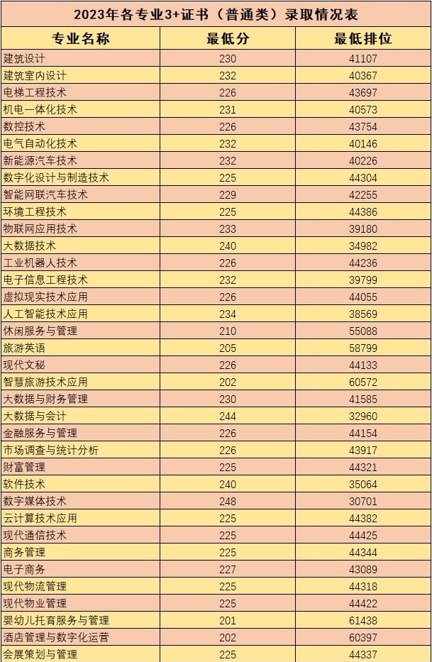 我校2023年春季学考普通类录取最低分为320分最低排位为130714,学考美术类录取最低分为244分,最低排位为8543,3+证书普通类录取最低分为225分,最低排位为44425,3+证书美术类录取最低分为225分,最低排位为44457。
