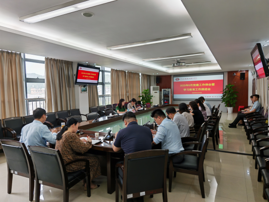 5月9日下午,学校在广州校区办公楼615室召开党建工作例会暨深入贯彻中央八项规定精神学习教育工作推进会。党委副书记方燕,各二级党委负责人,组织统战部全体人员参加会议。会议由组织统战部部长佘细花主持。