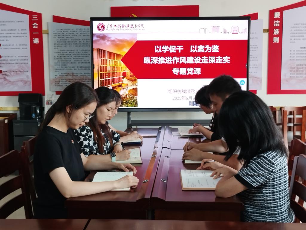 6月9日下午,组织统战部党支部通过视频连线方式在广州校区办公楼511室和省职教城校区办公楼508室开展作风建设专题党课。