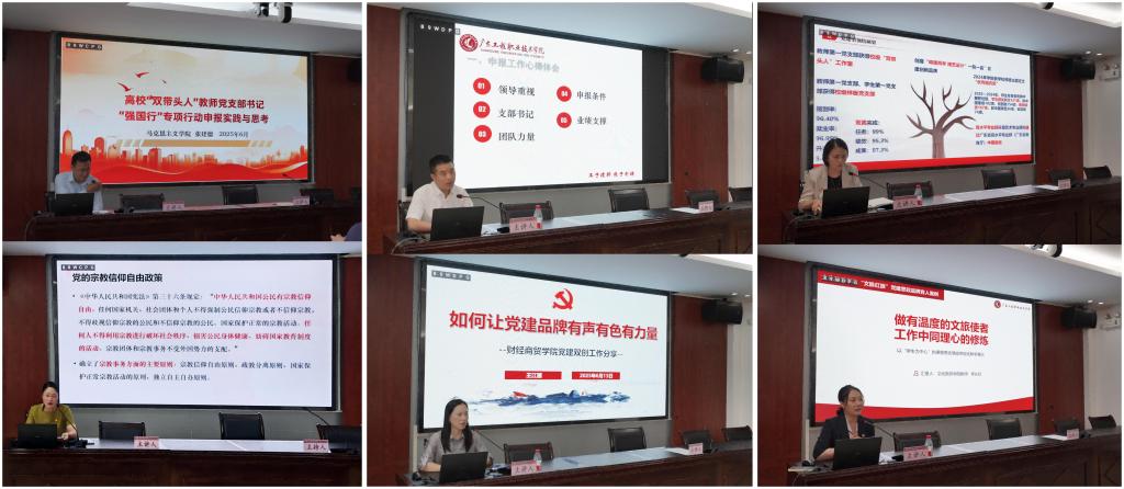 6月12日上午,培训班在广州校区办公楼511室正式开班,组织统战部部长佘细花作开班动员。马克思主义学院专任教师孔青梅作《新时代党员教师如何践行科学的宗教观——立德树人与阵地坚守》专题报告,深入阐释新时代党的宗教工作方针,强调高校教师应带头树立正确的宗教观,筑牢意识形态安全防线。在案例教学环节,国家级样板党支部书记王江丽、徐博龙以2位同志分别以《如何让党建品牌有声有色有力量》《全国党建工作样板支部建设情况汇报》为主题,从组织建设、品牌打造、示范引领等方面进行了深入分享;马克思主义学院书记张建德分享了“强国行”专项行动团队申报经验,分享了所在支部在党建联建、教育服务等方面的经验做法;艺术设计学院徐谌榕老师和文化旅游学院李长虹老师分别以《党建领航“艺”路行,思政融合结硕果》《科技点亮文化,思政锤炼精神——<视觉文创设计>课程教学展示》《做有温度的文旅使者 工作中同理心的修炼 以“学生为中心”的课程思政情感体验式教学展示》为主题,介绍了所在学院党建引领课程思政建设、思政元素有机融入专业教学的经验做法,为参训人员展示了可借鉴的实践范例,通过情景模拟、案例分析等方式,生动展示了新时代教师党员的职业素养与思想引领力。
